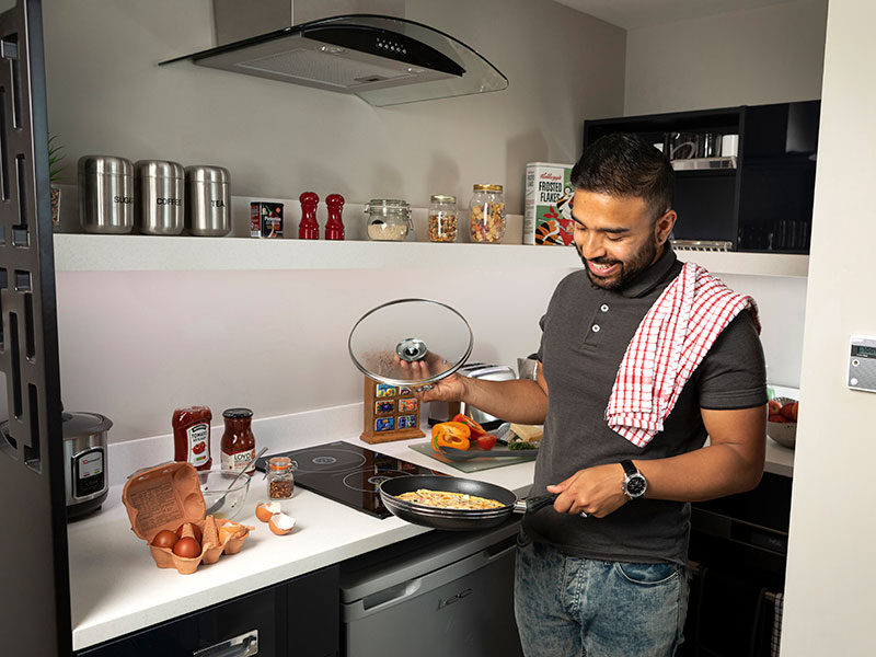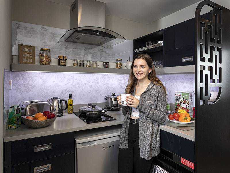 These Platinum en-suite rooms are designed to take care of the hard stuff, so you can enjoy student life to its fullest. Our Platinum en-suite apartment rooms are bigger than the Gold ones and come complete with your own en-suite bathroom, spacious work desk, large wardrobe, and a comfy double bed. The communal kitchen comes fully furnished with everything you need, from a private fridge/freezer and your very own storage space to those extra luxuries like rice cooker, Nutribullet, and wine cooler - because as we know it’s the little things in life! The living room is kitted out with comfortable sofas for you to relax and unwind on, whilst you challenge your flatmates to a game on the 55-inch flat-screen smart TV and accompanying games console that comes as a standard with each apartment.