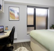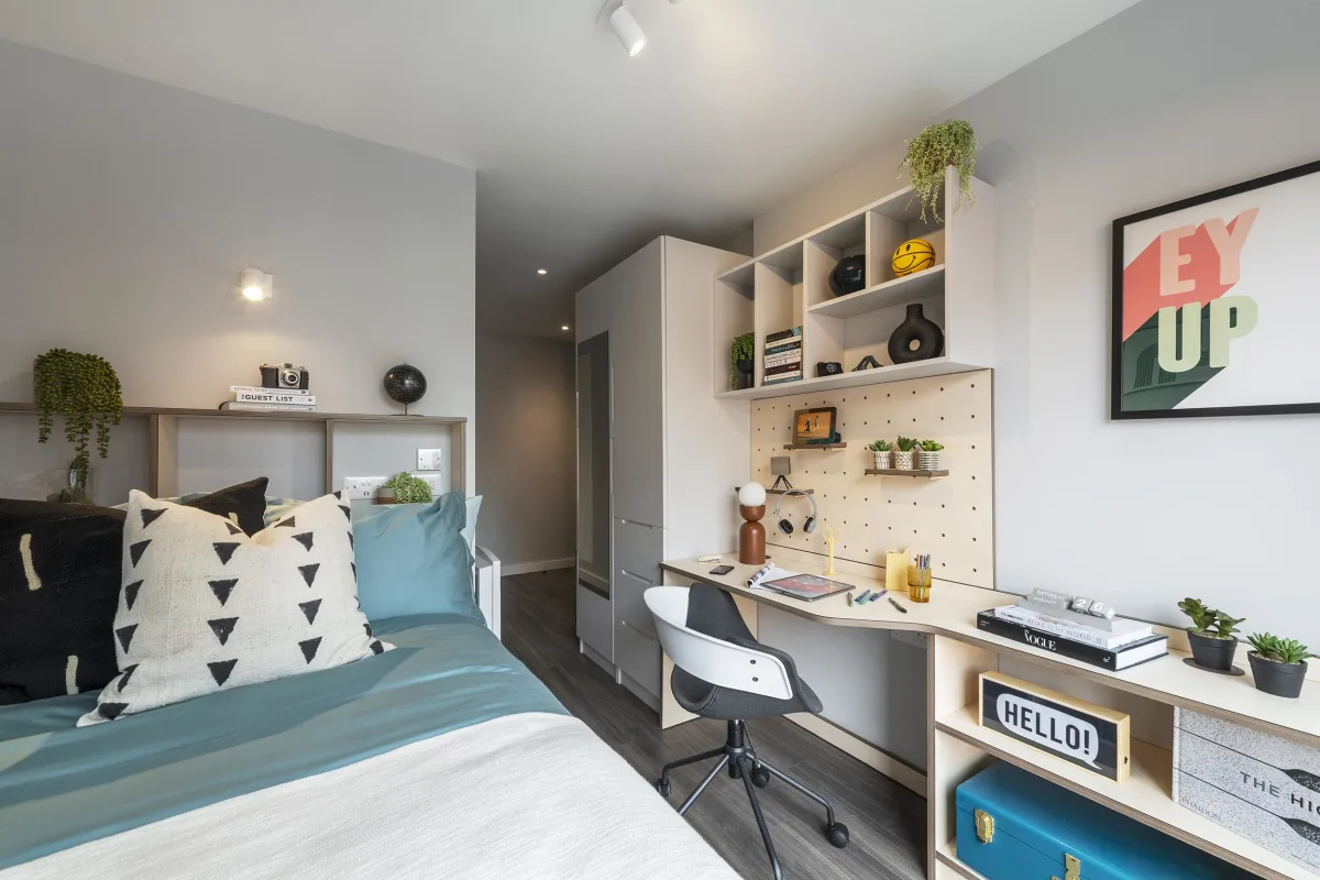 15.7m² | Small double bed, desk chair, wardrobe, headboard shelving, and under-bed storage Shared living, kitchen, and dining area with a fully fitted kitchen, washing machine, tumble dryer, dishwasher, smart TV, sofa, and dining table with chairs