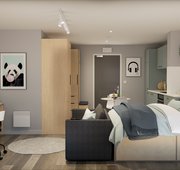 21.5 - 21.6 m² | Double bed, desk chair, wardrobe, bedside table, or additional shelving and under bed storage En-suite with a Smart TV, desk area, fully fitted kitchen with an integrated washer-dryer, dishwasher, and breakfast bar area