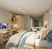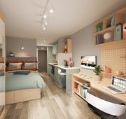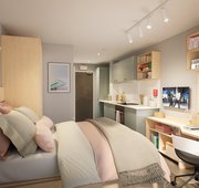 19.9 - 21.3 m² | Double bed, desk chair, wardrobe, bedside table or additional shelving and under-bed storage En-suite with a Smart TV, desk area, fully fitted kitchen with an integrated washer-dryer, dishwasher, and breakfast bar area