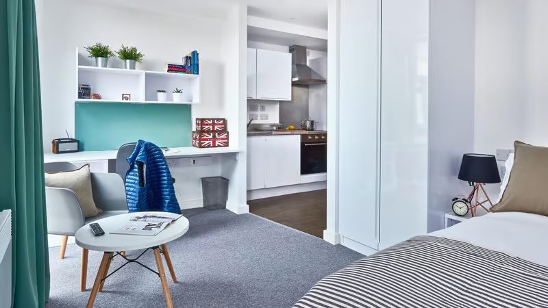 Our Deluxe Studio at Glassworks offers around 21m² of living area, perfect for students who enjoy a bit more room. This studio includes a 3/4 double bed, wardrobe, bedside table, coat hooks, and under-bed storage. The large desk and chair, bookshelves, and noticeboard create an efficient study environment. Enjoy a private bathroom and an open-plan kitchen with a fridge/freezer, microwave, toaster, kettle, oven, and induction hob.