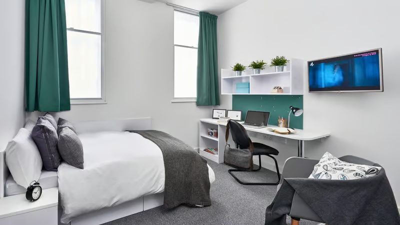 Our Standard Studio at Glassworks, starting from 18m², provides a cosy living space ideal for students. Featuring a 3/4 double bed, wardrobe, bedside table, coat hooks, and under-bed storage, this room offers practicality and comfort. The electric heater, large desk with a chair, bookshelves, and noticeboard make studying easy. Enjoy your private bathroom and the open-plan kitchen with a fridge/freezer, microwave, toaster, kettle, oven, and induction hob. The lounge area with a chair and Freeview TV provides a relaxing retreat.