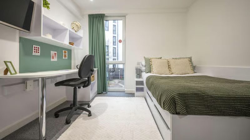 Enjoy the comfort of our Premium Studio at Glassworks, sized from 19m². This room features a 3/4 double bed, wardrobe, bedside table, coat hooks, and under-bed storage. With an electric heater, large desk, chair, bookshelves, and noticeboard, you’ll have a comfortable study environment. The private bathroom adds convenience, and the open-plan kitchen, equipped with a fridge/freezer, microwave, toaster, kettle, oven, and induction hob, is perfect for cooking.