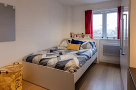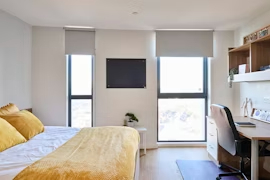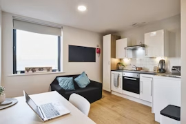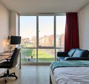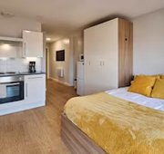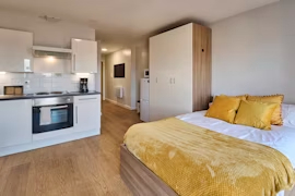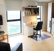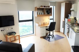 Self contained kitchen and living space. En-suite bathroom with power shower Situated on 6th - 11th floor Approximately 19.2m² Double bed, wardrobe, bedside table and full length mirror (Please note that bedding and other soft-furnishings are not included) 2 tub chairs or two seater sofa and coffee table. Wall-mounted HD ready flat screen TV and package Kitchen includes a built-in oven, microwave and fridge/freezer (Room size may vary due to shape)