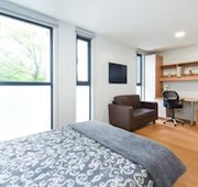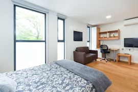Self contained kitchen and living space. En-suite bathroom with power shower Dual Occupancy Available Rooms approximately 26.2m² Double bed Wardrobe, sofa or 2 chairs, wardrobe, study desk and chair, TV, built in kitchen with appliances Photography is for illustrative purposes, actual room may vary