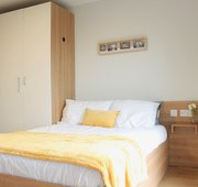 Self-contained kitchen and living space Situated on the ground floor Approximately 16.8m2 Double bed, triple wardrobe and a large desk (Please note that bedding and other soft-furnishings are not included) Includes en-suite bathroom with double shower HD Flat Screen TV, comfortable leather sofa