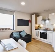 Self-contained kitchen and living space. En-suite bathroom with power shower Situated on 1st-5th floor Approximately 19.1m² Double bed, wardrobe, bedside table and full length mirror (Please note that bedding and other soft-furnishings are not included) 2 tub chairs or two seater sofa and coffee table. Wall-mounted HD ready flat screen TV and package Kitchen includes a built-in oven, microwave and fridge/freezer