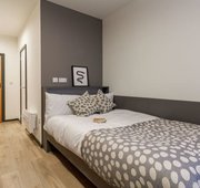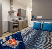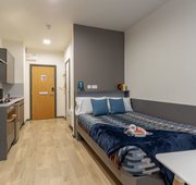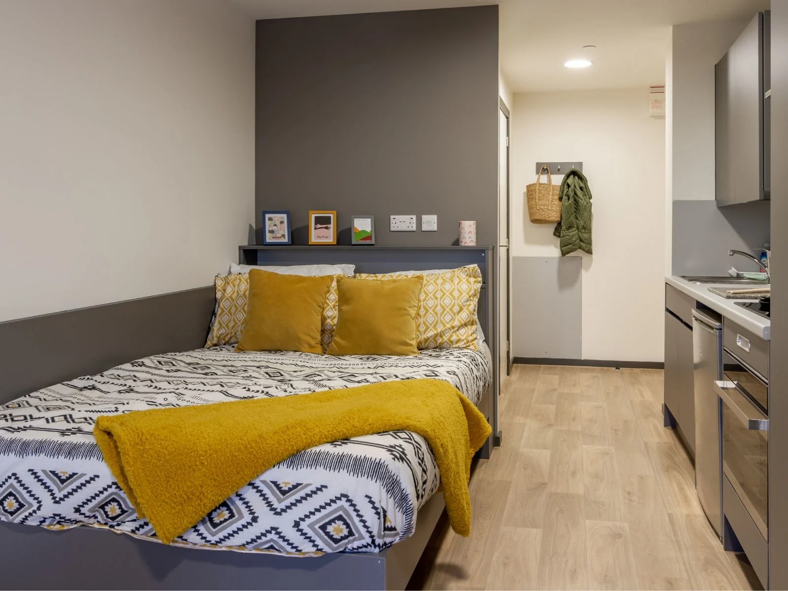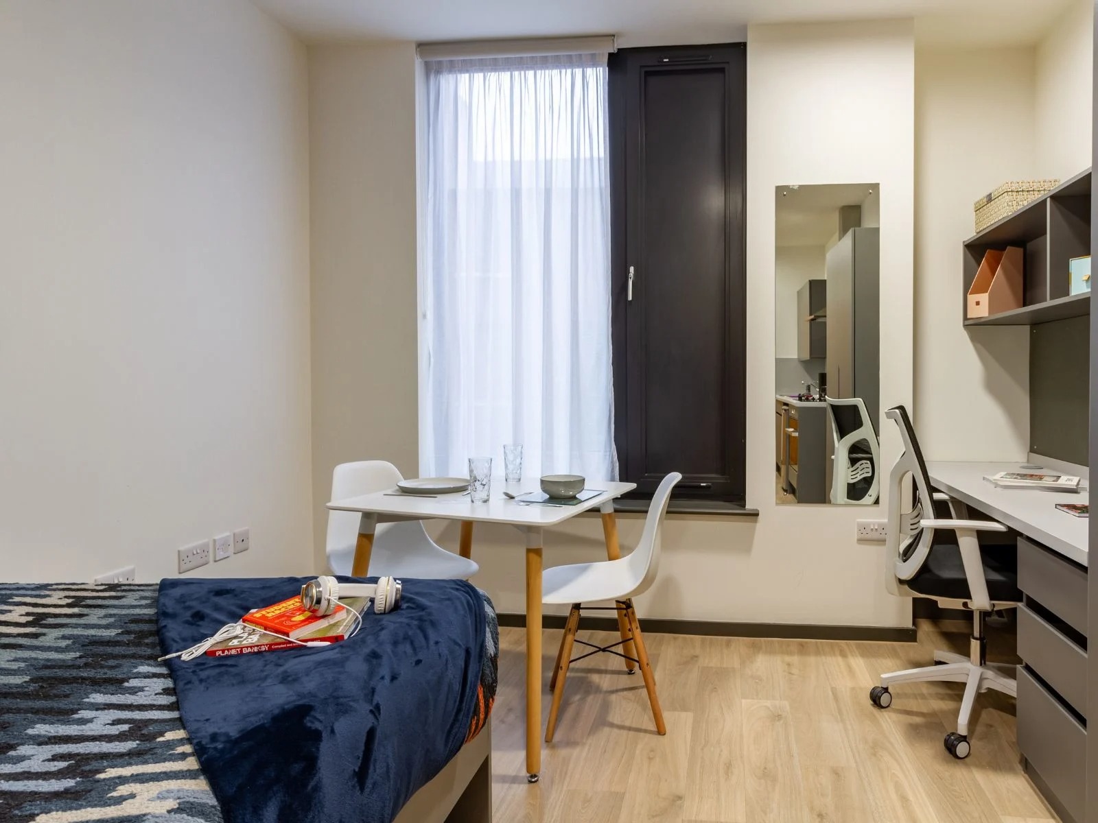 Enjoy this stylish en suite bedroom located on the ground floor, equipped with a small double bed, study area and bags of storage space. Our Classic En Suites come with 13-14sqm of sp. You'll have access to the shared kitchen and living space, where you will be sharing with up to 6 people.