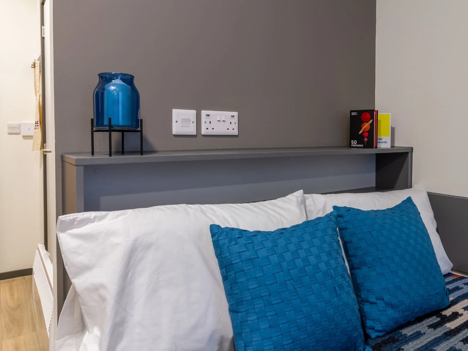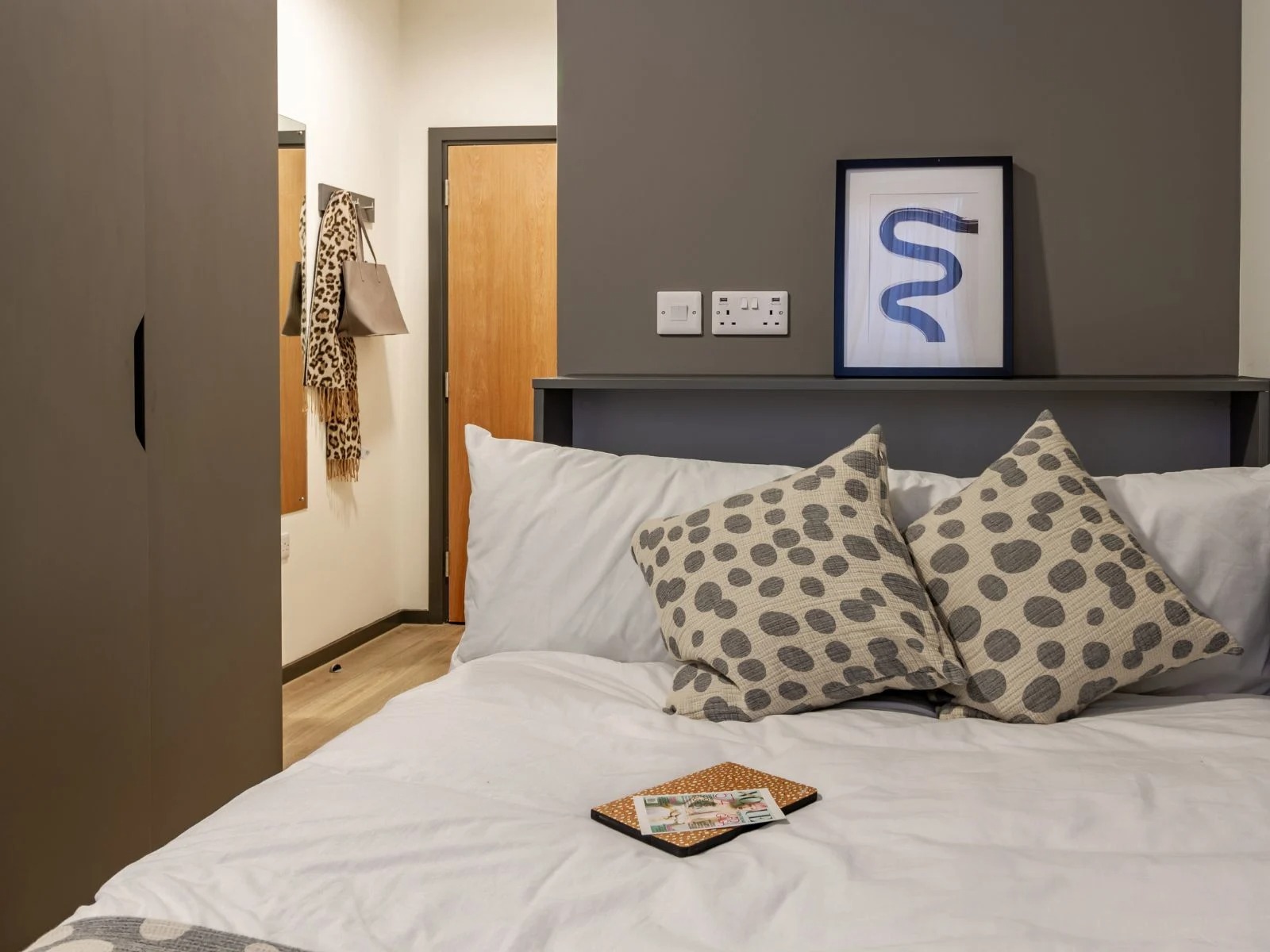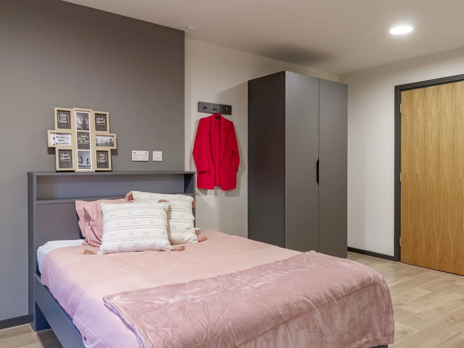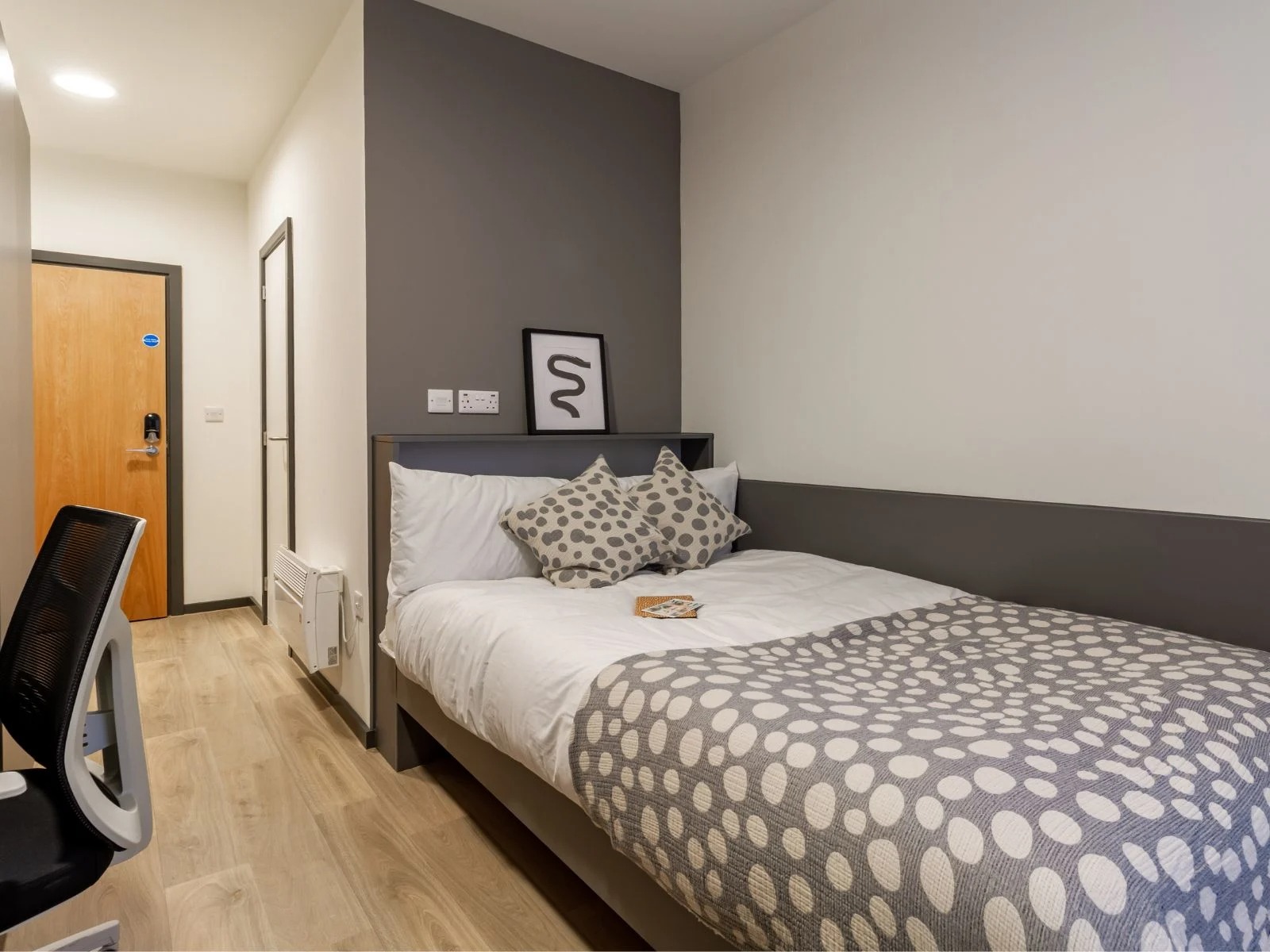 Enjoy this stylish en suite bedroom, equipped with a small double bed, stu dy area and bags of storage space. Our Silver En Suites come with 13-16sqm of space! Plus, you'll have access to the shared kitchen and living space, where you will be sharing with up to 5 other people.