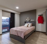 Enjoy this stylish en suite bedroom, equipped with a small double bed, study area and bags of storage space. Our Bronze En Suites come with 13-14sqm o f space! Plus, you'll have access to the shared kitchen and living space, where you will be sharing with 7 other people.