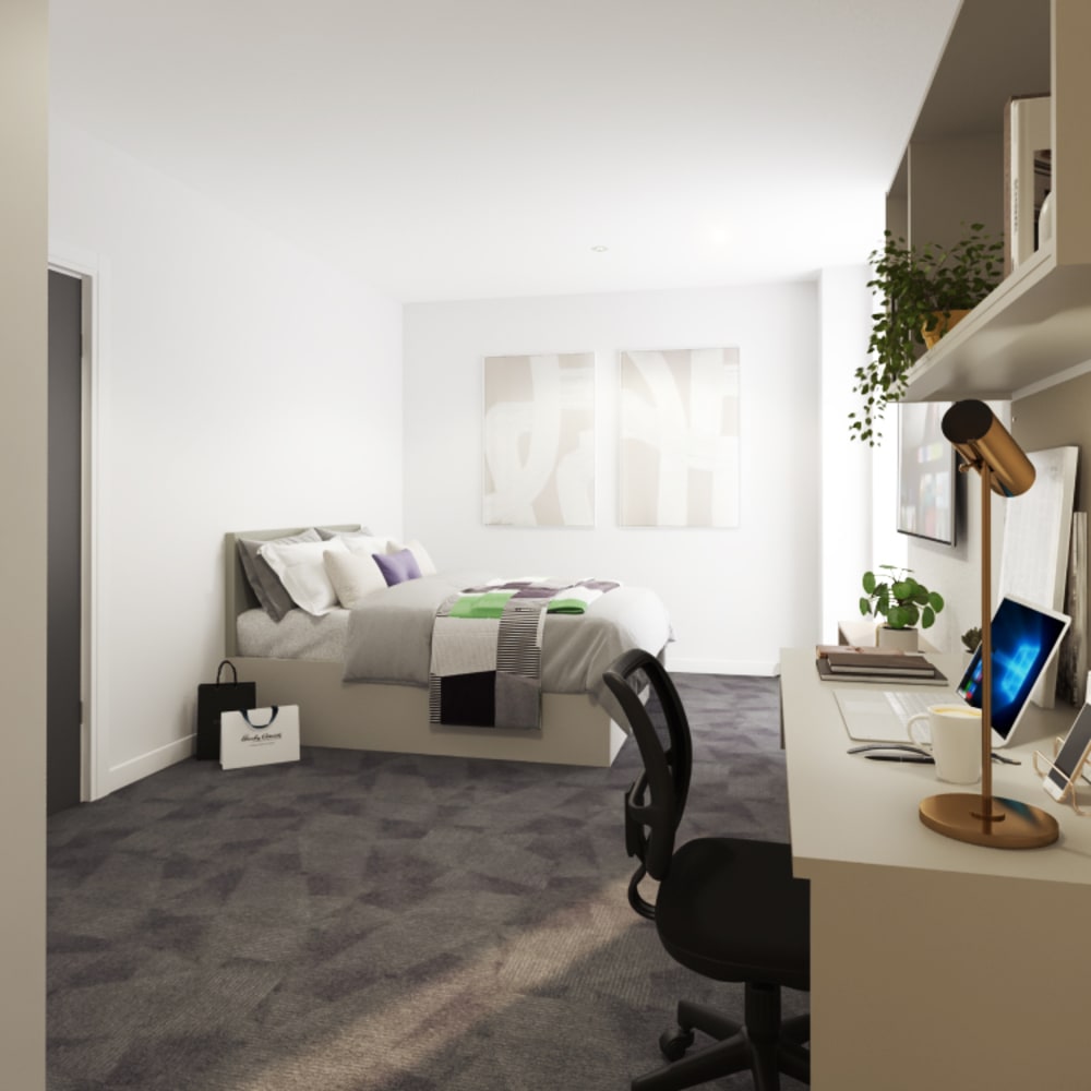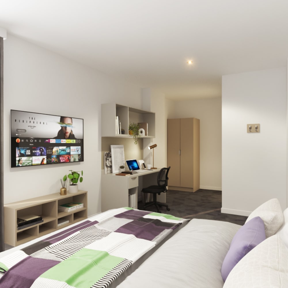 Our shared apartments at true Leicester are perfect for social living, as you'll share a kitchen, dining and lounge area with 9 flatmates. This option still includes the privacy of your own ensuite bedroom with comfy double bed, TV, desk area and luxury bathroom.*Price may vary as per floor levels.