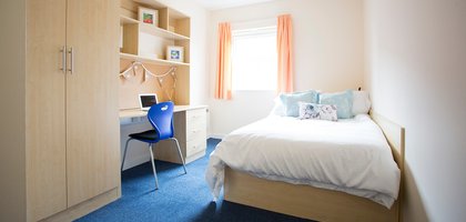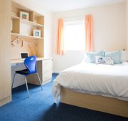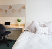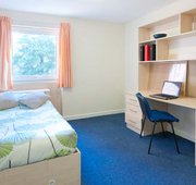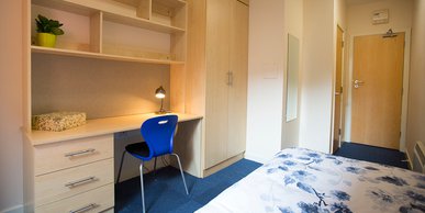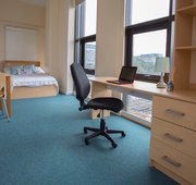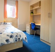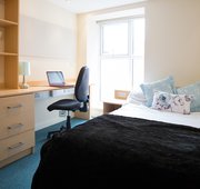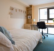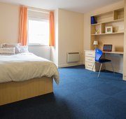 En-suite bedroom in a 6-bedroom flat, this is our larger room option with a double bed with under bed storage, study area - desk with desk draws, wardrobe, chair and full-length mirror. En suite comprises of washbasin, mirror, toilet and shower cubicle. Please note there are variances on room sizes and layout. The shared area includes a kitchen / communal area with cooker, fridge/freezer, microwave, kettle and table & chairs, comfy sofa and TV - WIFI throughout.