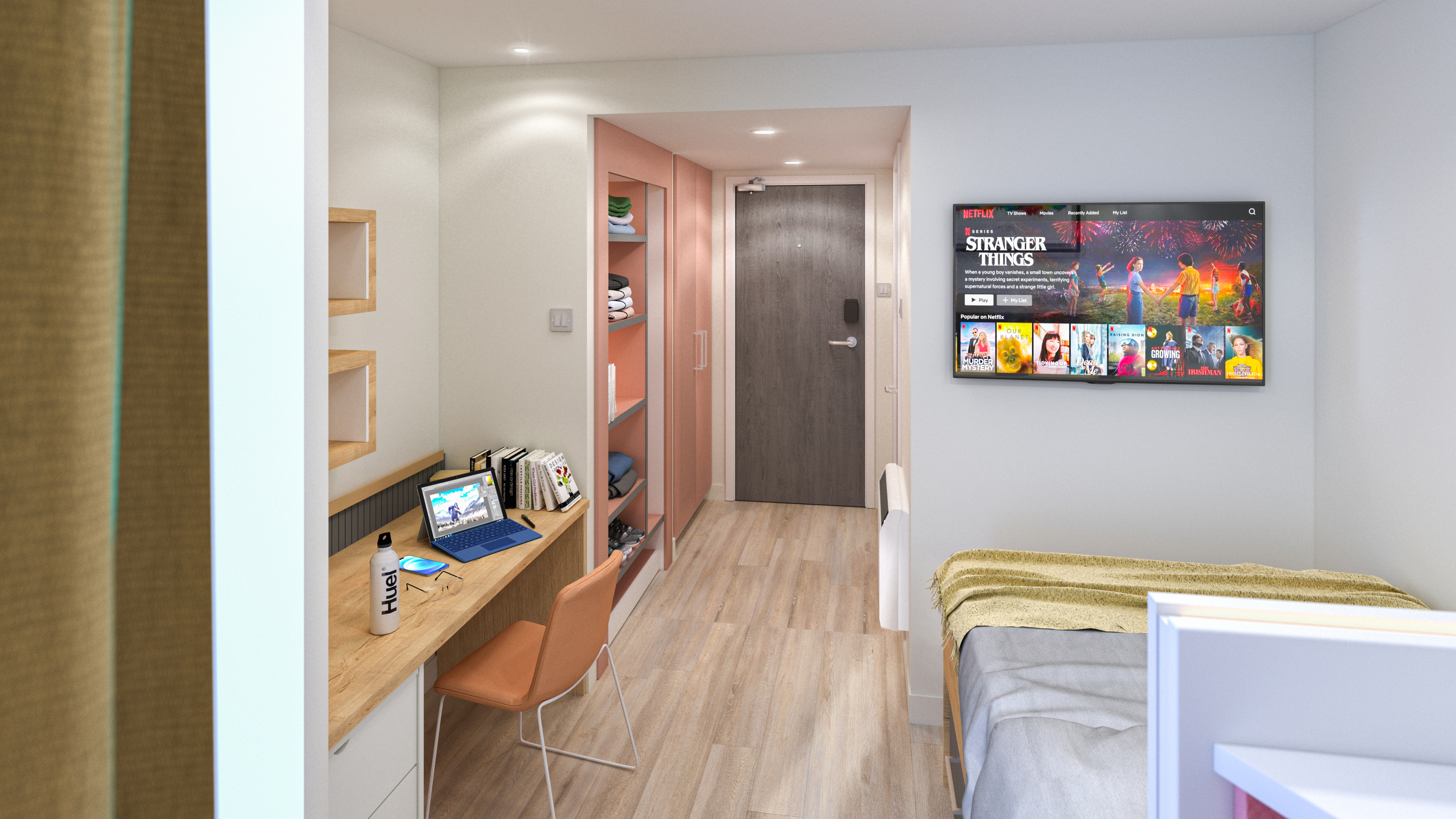 An en-suite room featuring a double bed, wardrobe, study desk, chair, large flat screen TV, en-suite bathroom, and access to a shared kitchen and communal spaces.