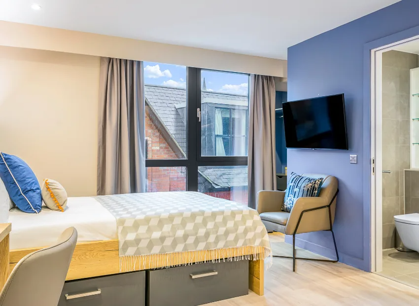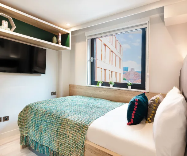 The Smart studio gives you the room to sleep, study and socialise. This medium size apartment has a comfortable double bed, en-suite bathroom and a fitted kitchen. Prices may vary depending on the floor level.