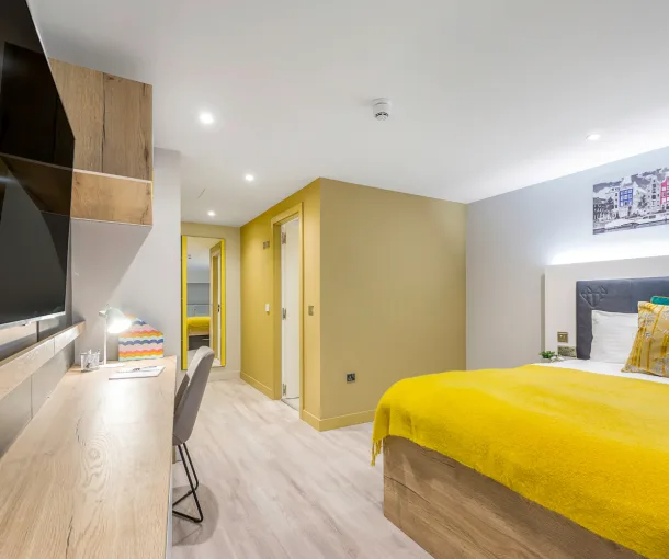 The Nest apartment offers a unique en-suite room, complete with double bed, large flat screen TV & desk, plus access to a shared kitchen & communal spaces. Prices may vary depending on the floor level.