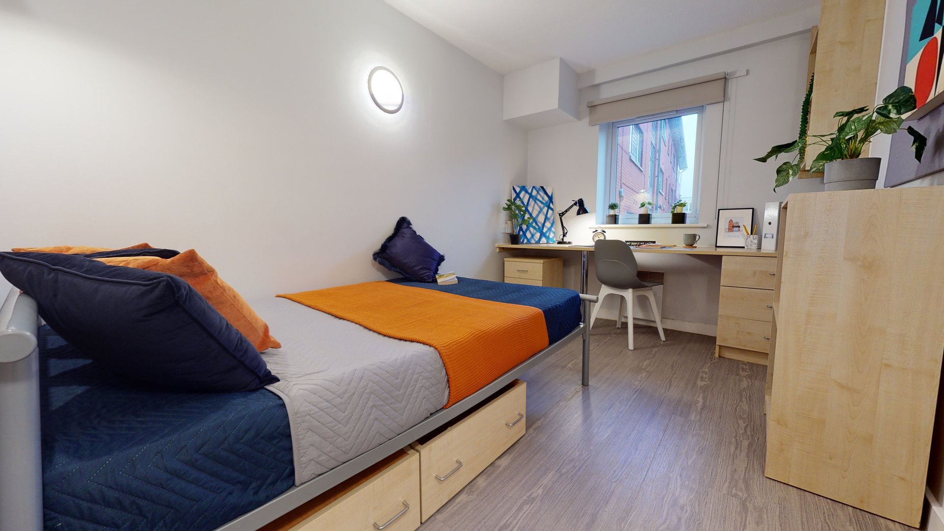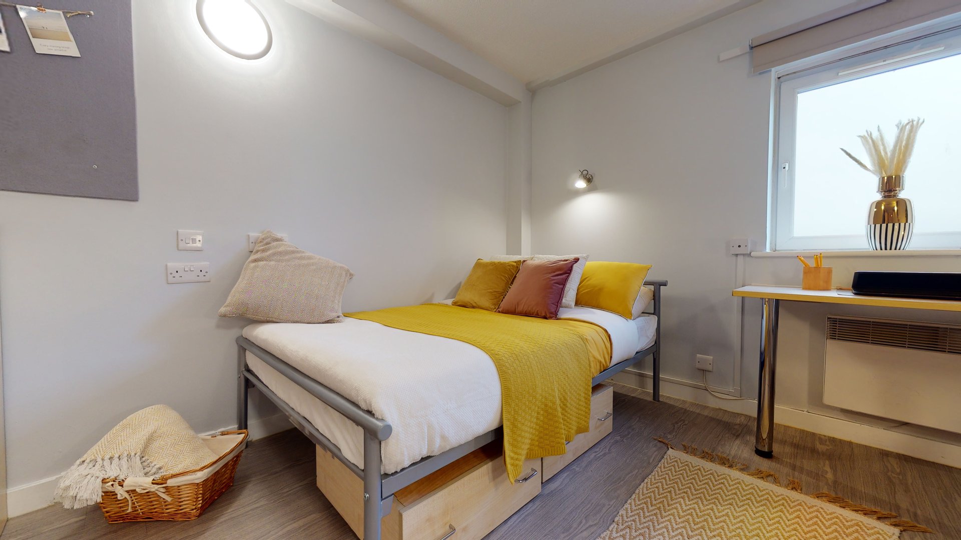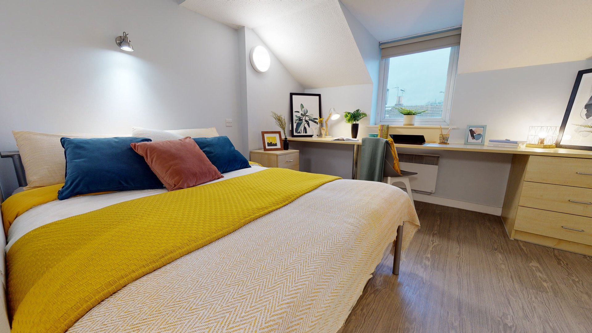HAYE300-031125With 17 sq m floor plan and located on floors 6-8, the renovated Silver En Suite Plus rooms provide you with the best views whilst featuring a private bathroom and plenty of natural light, with hardwood flooring and modern furniture as standard. Your room includes a small double bed, study desk and chair and lots of storage, giving you all the privacy you need. A spacious open-plan living room and kitchen is shared with up to four others, with TV, corner sofa and all the essential appliances.