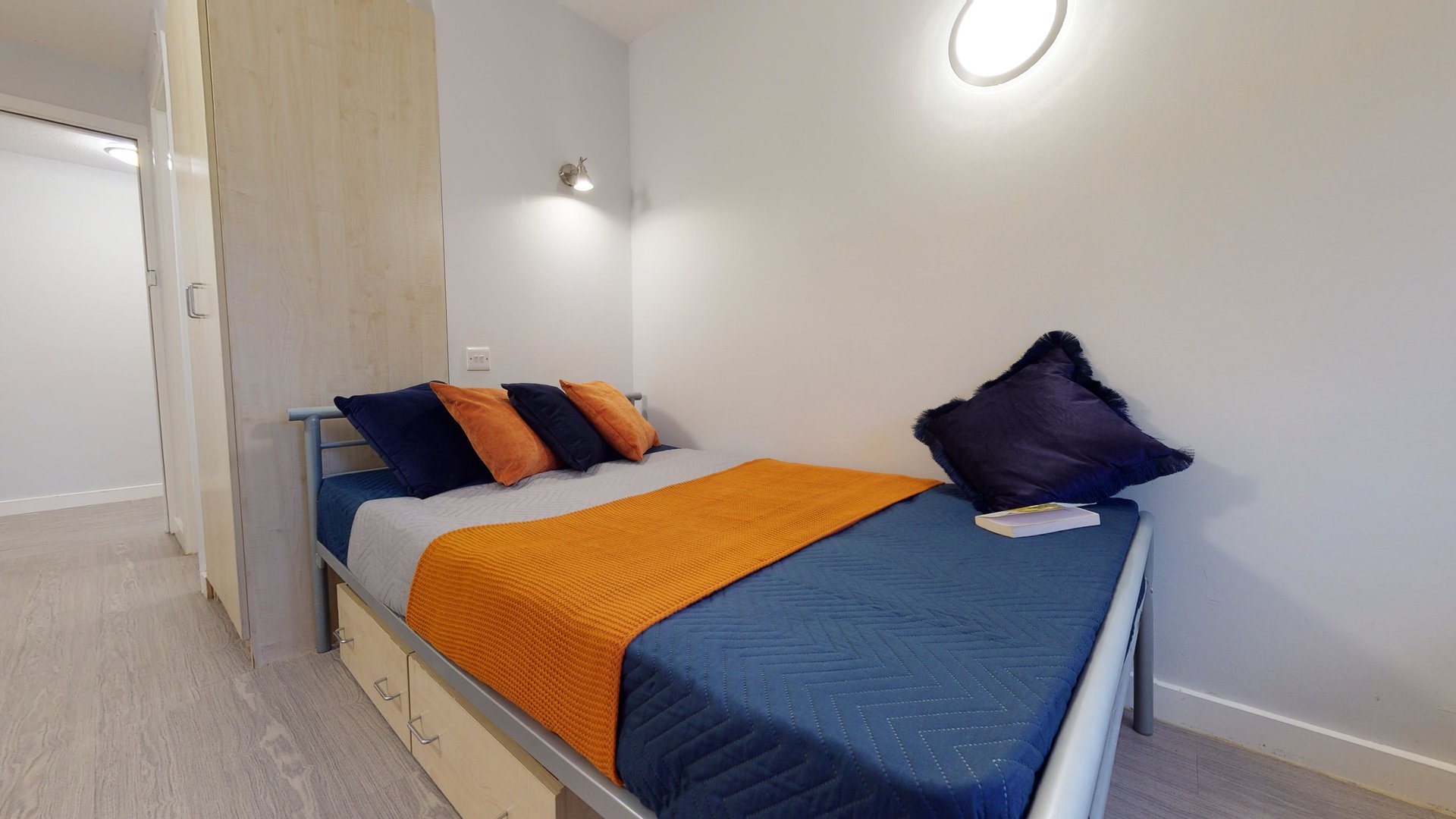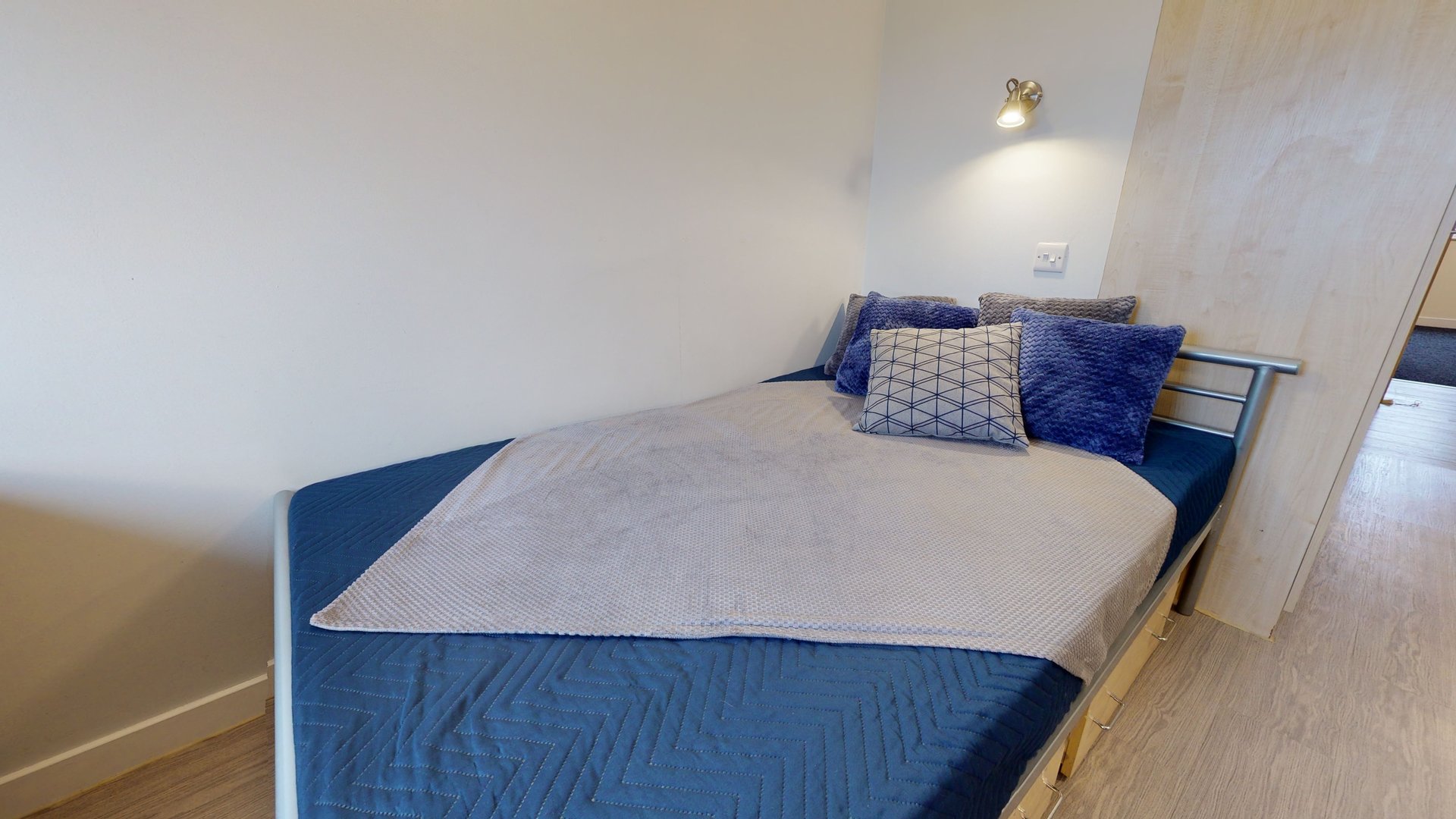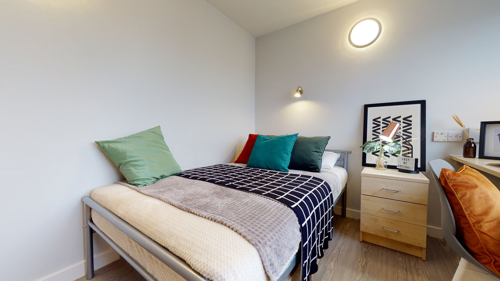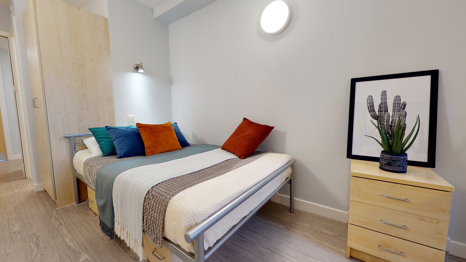 HAYE300-031125With 17 sq m floor plan and located on floors 6-8, the renovated Silver En Suite Plus rooms provide you with the best views whilst featuring a private bathroom and plenty of natural light, with hardwood flooring and modern furniture as standard. Your room includes a small double bed, study desk and chair and lots of storage, giving you all the privacy you need. A spacious open-plan living room and kitchen is shared with up to four others, with TV, corner sofa and all the essential appliances.