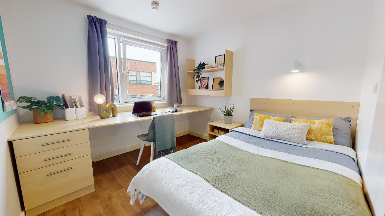 These rooms come with a private bathroom and a small double bed, plenty of storage plus study desk and chair. Your spacious communal kitchen and living area with TV are shared with your flatmates, giving you the benefits of a social vibe too.