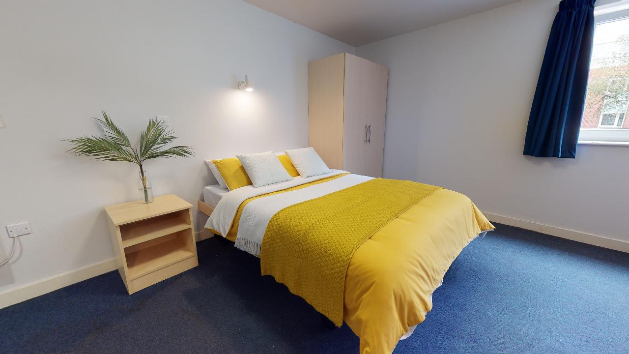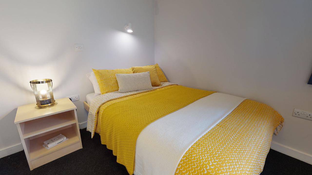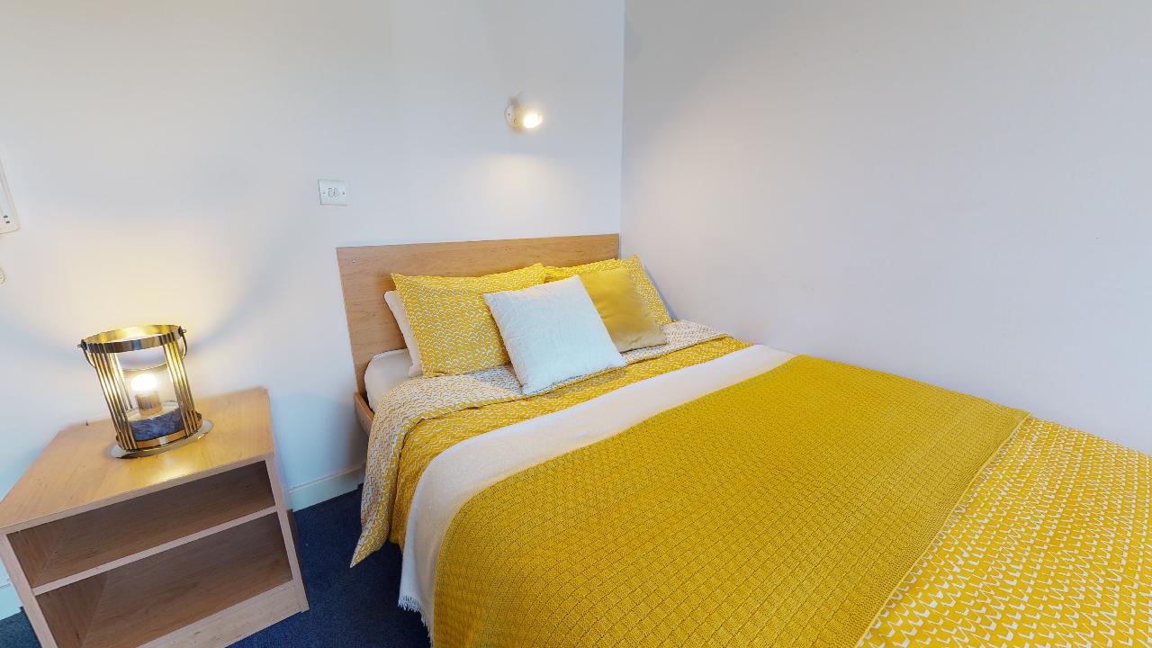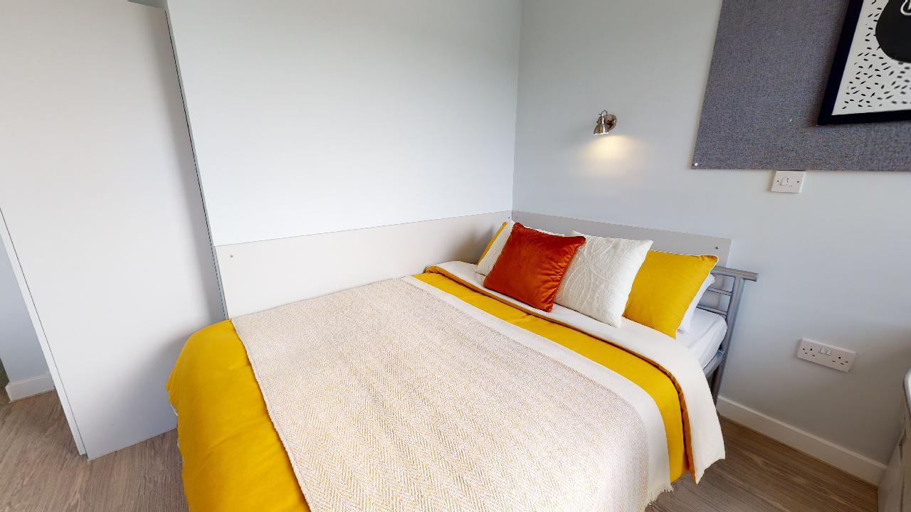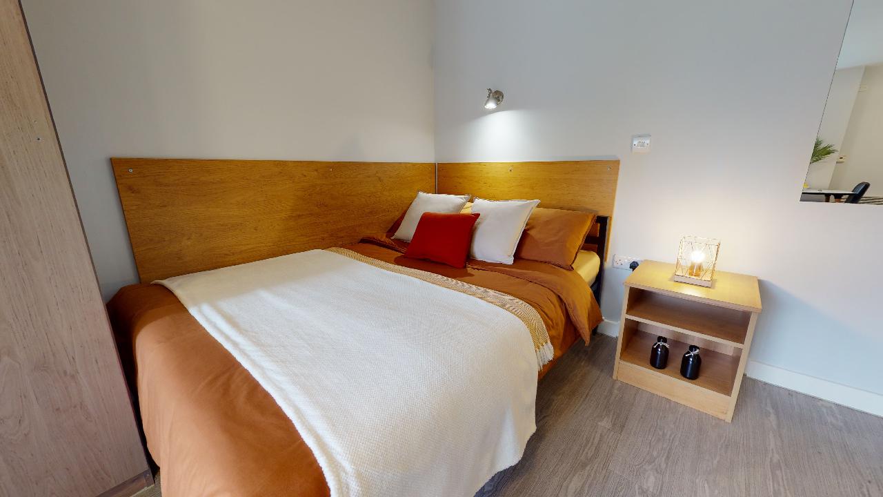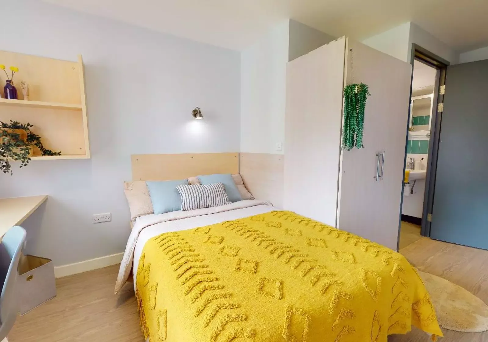 PAVI300-031125Coming with the same great features as our Silver En Suite option, these rooms have the added benefit of being renovated to a high standard with modern furniture and fittings. These spacious rooms come with private bathroom and small double bed, plus study desk and chair and lots of storage. Your communal kitchen and living space with TV is shared with your flatmates, giving you a great social vibe too.