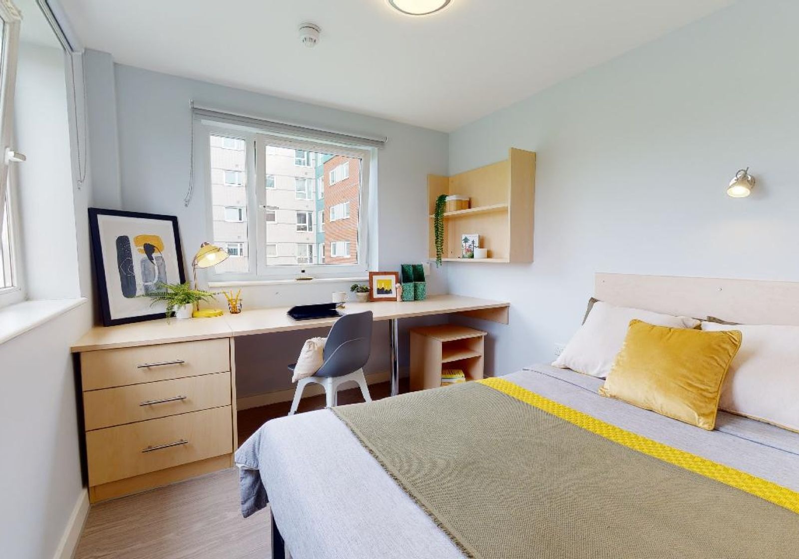 PAVI300-031125Offering all the same great features of our Bronze En Suite rooms, these 15 sq m rooms provide you with top floor city views These rooms come with a private bathroom and small double bed, plenty of storage plus study desk and chair. Your spacious communal kitchen and living area with TV are shared with your flatmates, giving you the benefits of a social vibe too.