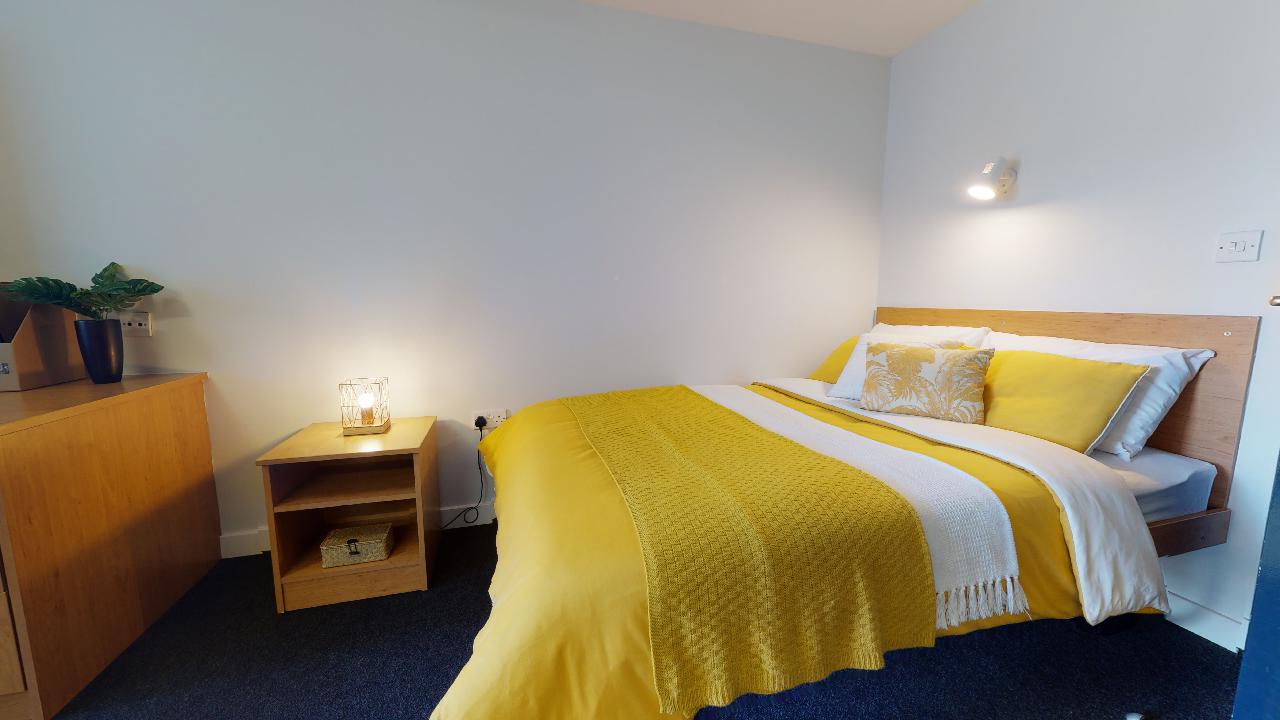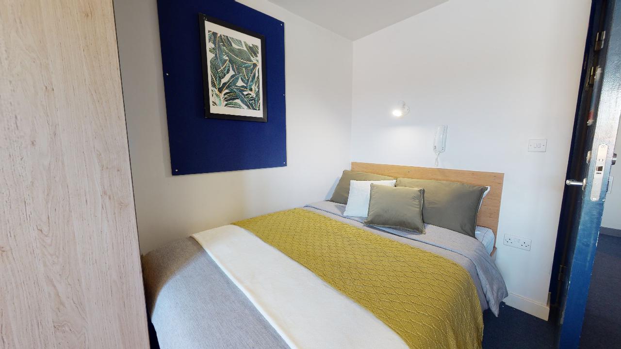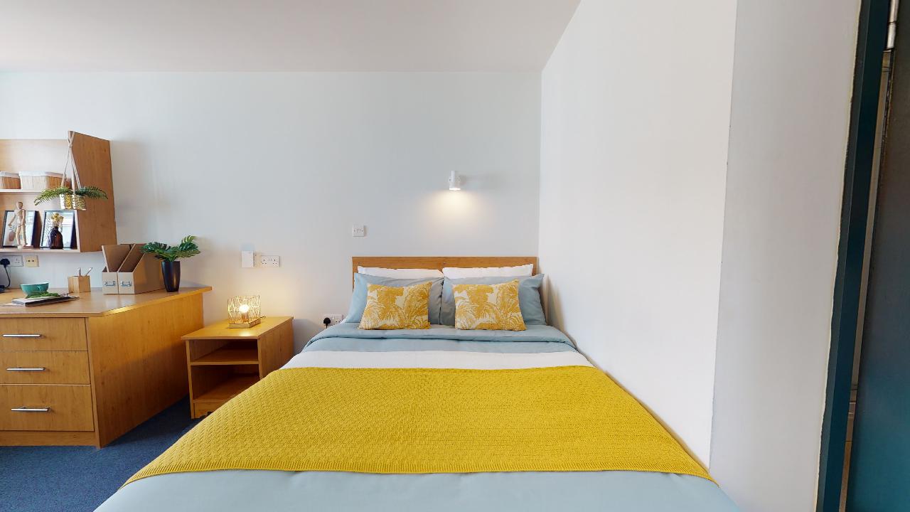 PAVI300-031125Upgrade your student lifestyle with a more roomy feel than the Gold Studio, with private bathroom, kitchen, double bed and plenty of furniture. As well as the essential private bathroom and double bed, your studio also features a well-equipped kitchenette with oven, microwave, dishwasher and fridge, breakfast bar and TV. With lots of storage and great furniture, you’ll have everything you need for comfortable student living.
