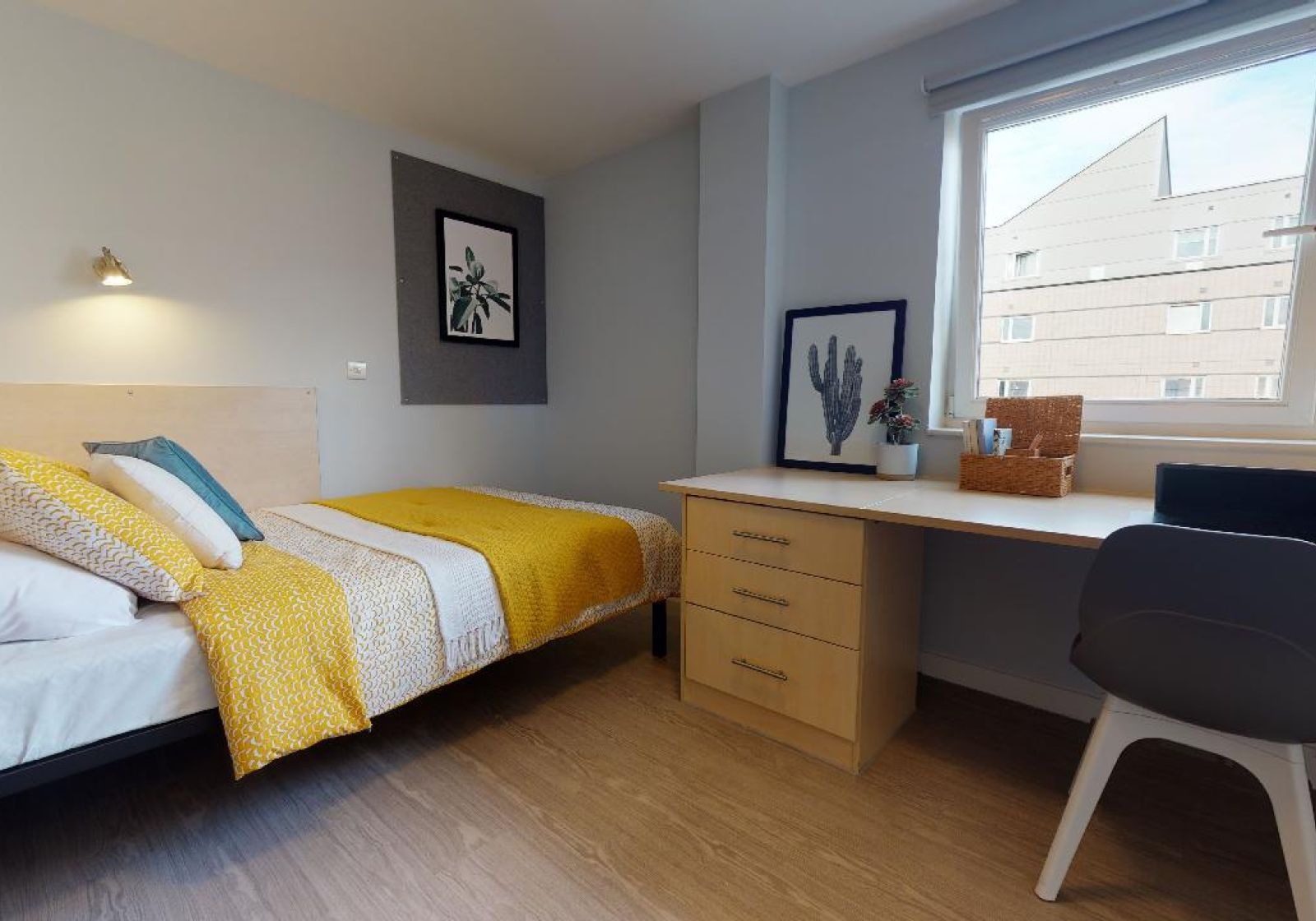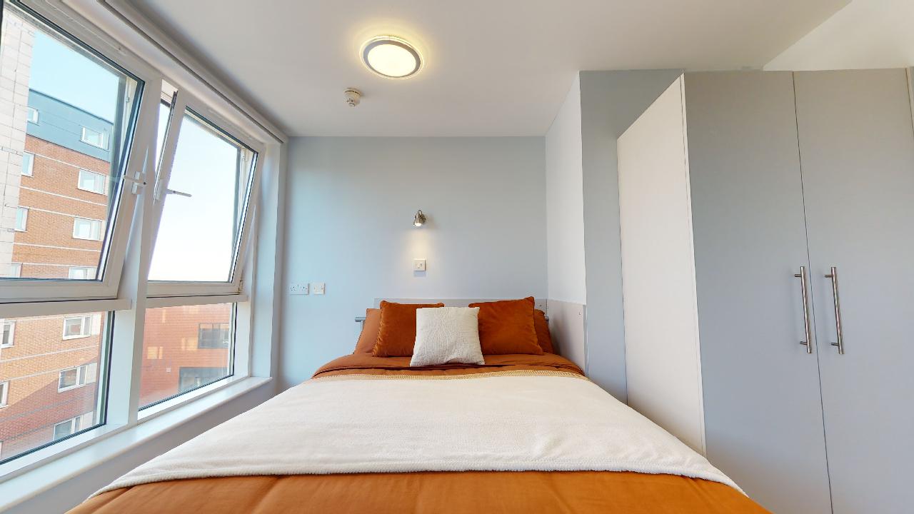 PAVI300-031125Offering the best views of the city on floors 6-8 and the largest space of approx 24 sq m. Your room comes with a private bathroom, small double bed, study desk and chair and lots of storage, giving you all the privacy you need. A spacious open plan living room and the kitchen is shared with up to four others, with TV, corner sofa and all the essential appliances.