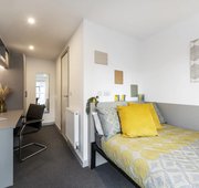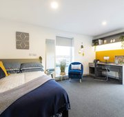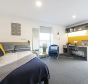 Each room includes a 3/4 double bed with storage, USB charging points, a built-in wardrobe, and a large desk with shelving and LED lighting – ideal for studying and relaxing. The private ensuite features a shower, toilet, sink, shelves, and mirror – no bathroom queues here! Available in our 6-bedroom houses with a cosy living room and separate kitchen, and in our 9- and 13-bedroom houses with larger open-plan kitchen/lounges – perfect for movie nights and social hangouts.