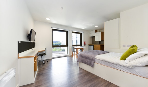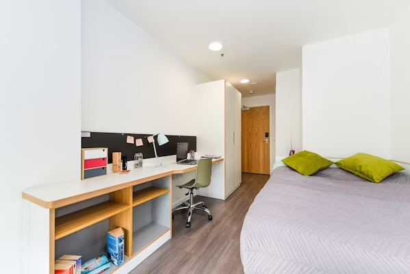 Communal kitchen and living space with up to 5 en-suite rooms per flat Approximately 13.9m² Small double bed Underbed storage, wardrobe, personal study space with desk and chair