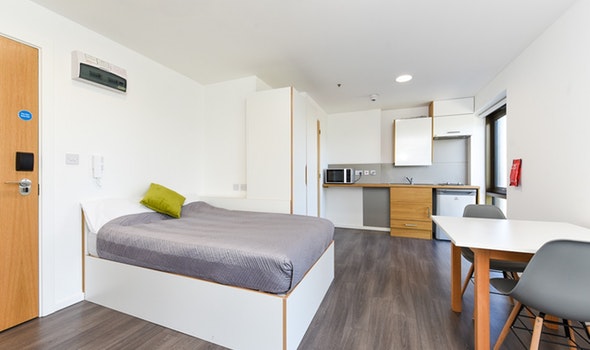 Self-contained studio with bedroom kitchen and bathroom Dual occupancy available Approximately 25.4m² Small double Underbed storage, wardrobe, personal study space with desk and chair