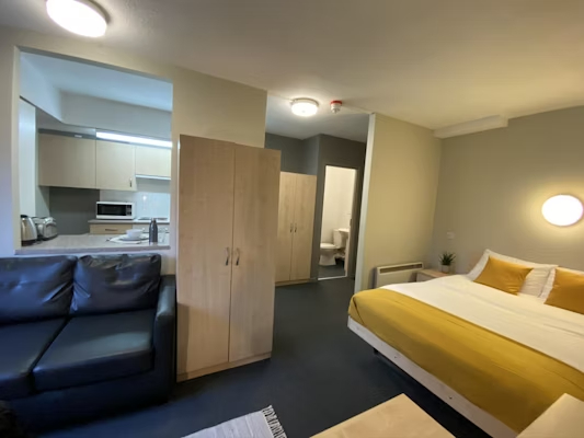 Self-contained studio with bedroom kitchen and bathroom Dual occupancy available Approximately 20.6m² Double bed Under-bed storage, wardrobe, personal study space with desk and chair. Self-contained kitchen with fridge/freezer and microwave