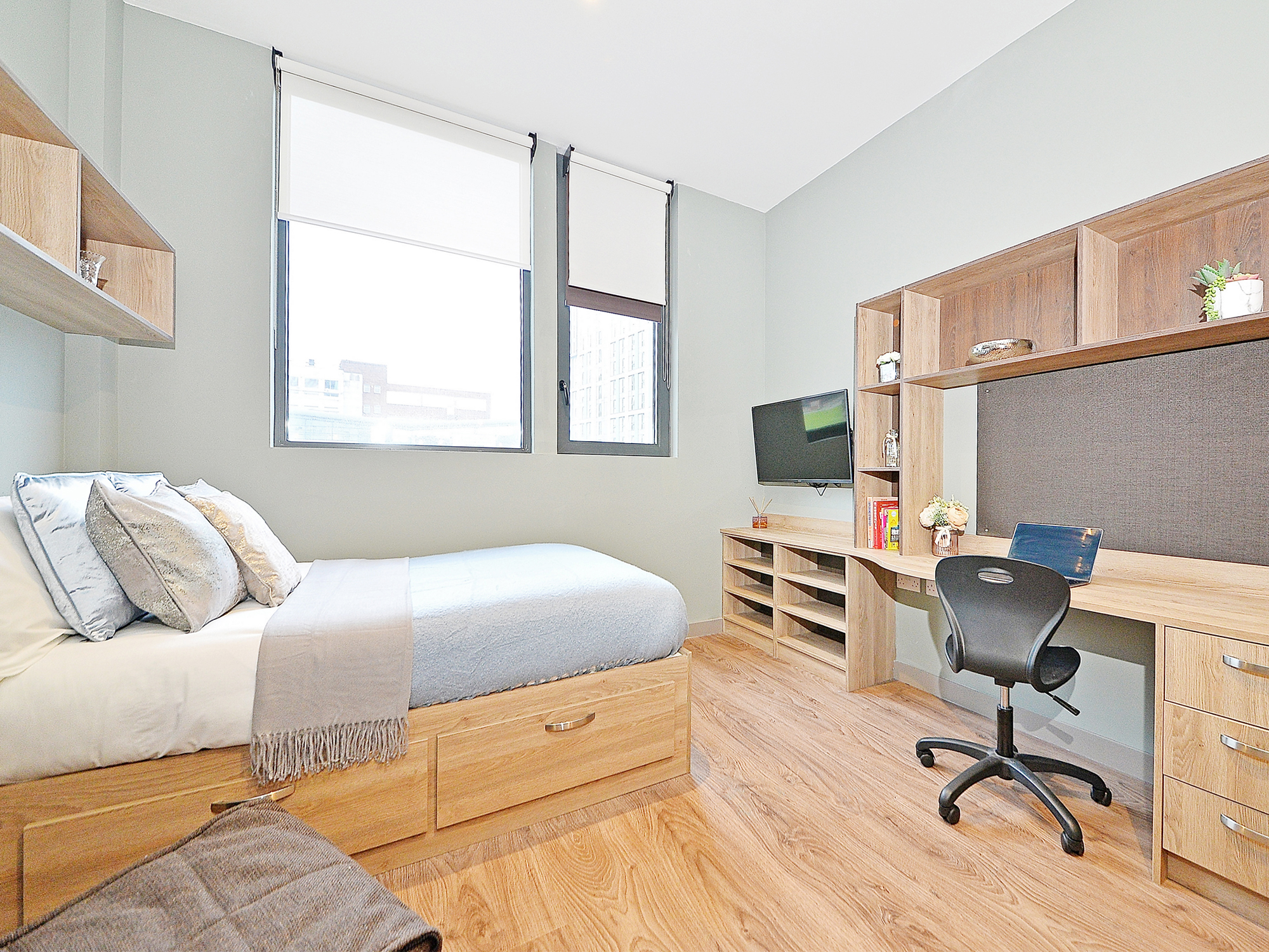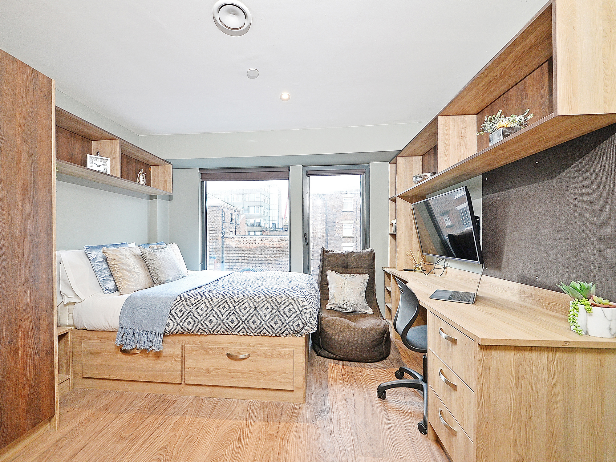 Our super spacious luxury studio measures 23-28.2m2 and has everything the modern student needs for the perfect home away from home. Enjoy a comfy double bed, a double wardrobe, your very own study desk and even a 32” flat screen TV! Cook something scrumptious in your own high-quality kitchenette with a fridge, combination microwave, breakfast bar with stools and a 4-ring Induction Hob and a dishwasher! Make the most of your own luxury private space with fabulous communal areas for when you feel like socialising.