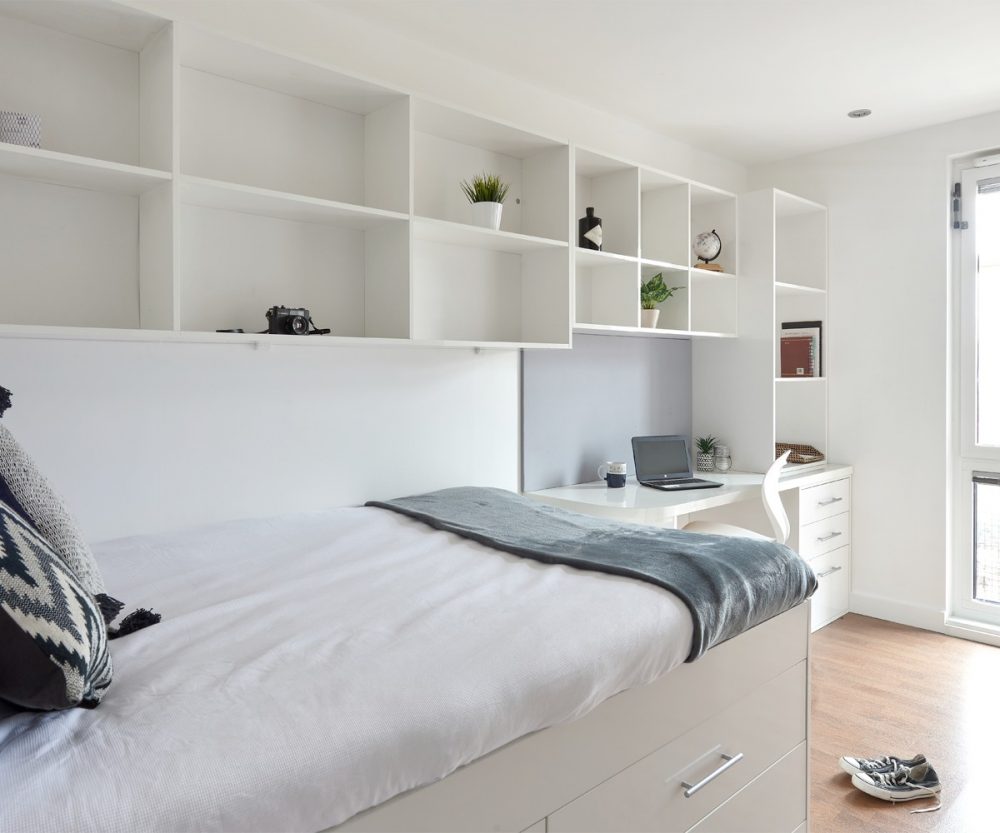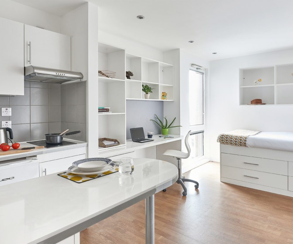The premier studio ultra, from 18m2, are perfect for you if you require your own private home away from home space before venturing out into the wider community at Hope Street. They are designed to give you the right amount of space for everything you need. Your studio comes with a 3/4 double bed, wardrobe and desk space, kitchenette with storage, an ensuite bathroom and a smart TV.