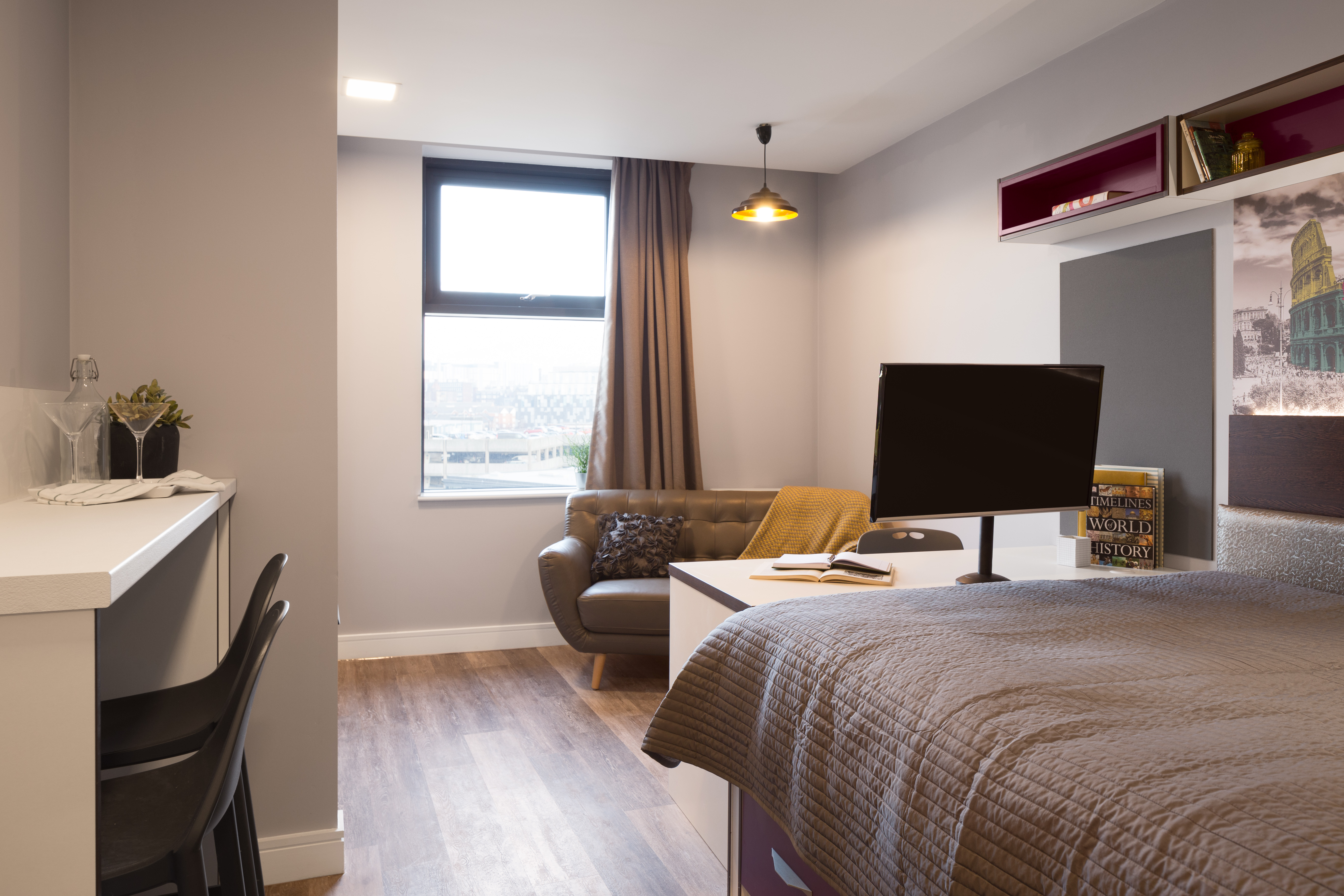 The Smart studio gives you the room to sleep, study and socialise. This medium size apartment has a comfortable double bed, en-suite bathroom and a fitted kitchen. Prices may vary depending on the floor level.
