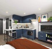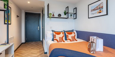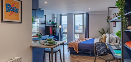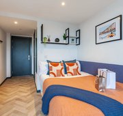 This luxurious room located on floors 1-3 and measuring 20 – 22sqm, you can jump into your comfy double bed with overhead storage and headboard or cook up something good in your modern kitchen space which comes equipped with a 2-ring electric cooker hob, electric oven, microwave and fridge freezer. Forget about waiting for someone else to make their food, it’s all yours, and you can eat it at your breakfast bar! You’ll also have your own modern en-suite bathroom with a shower and WC, and a study space for you to get any revision done for your degree. The best part about choosing this option is that there’s still tons of opportunities to meet new people within our communal areas, including our Lounge Area which is ideal for relaxing with others, our games room which features a pool table and a Flight Club style darts booth and our 25-seater “Lumiere’ cinema room where you can watch a variety of films on the big screen. We also have accessible studios available, please get in touch to discuss more.