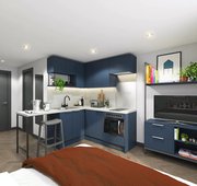 Our Platinum Suites – Top Floor are located on the ninth floor, measuring between 25-27sqm. Within this room style you’ll have your own double or King bed with storage, a study desk and chair, a wardrobe, pinboard, full-length mirror, booster fan and your own en-suite bathroom. You can make the most of the amazing views across Liverpool City Centre from your floor to ceiling windows. You’ll also have your own kitchen which comes equipped with a bar stool so you can cook up a storm and unwind.