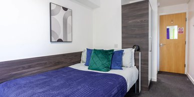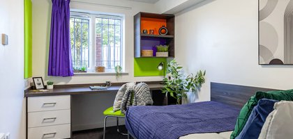 Choose our Classic Ensuite room for your own modern apartment featuring a comfy small double bed, a desk and chair, ensuite bathroom and ample storage space. You’ll also have access to a shared kitchen and living space with a breakfast bar, so you can host your own cooking nights.