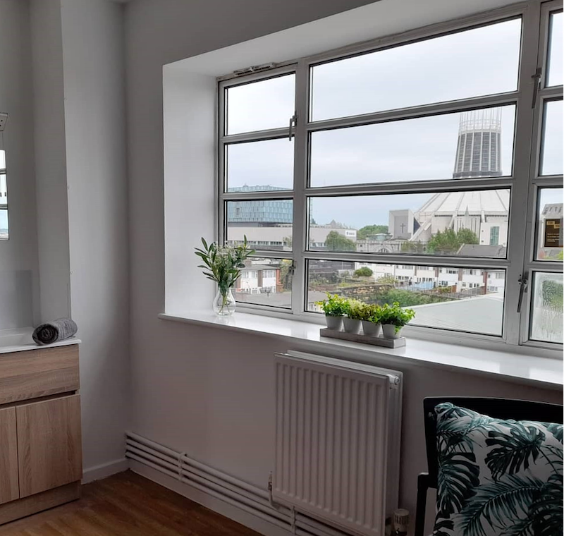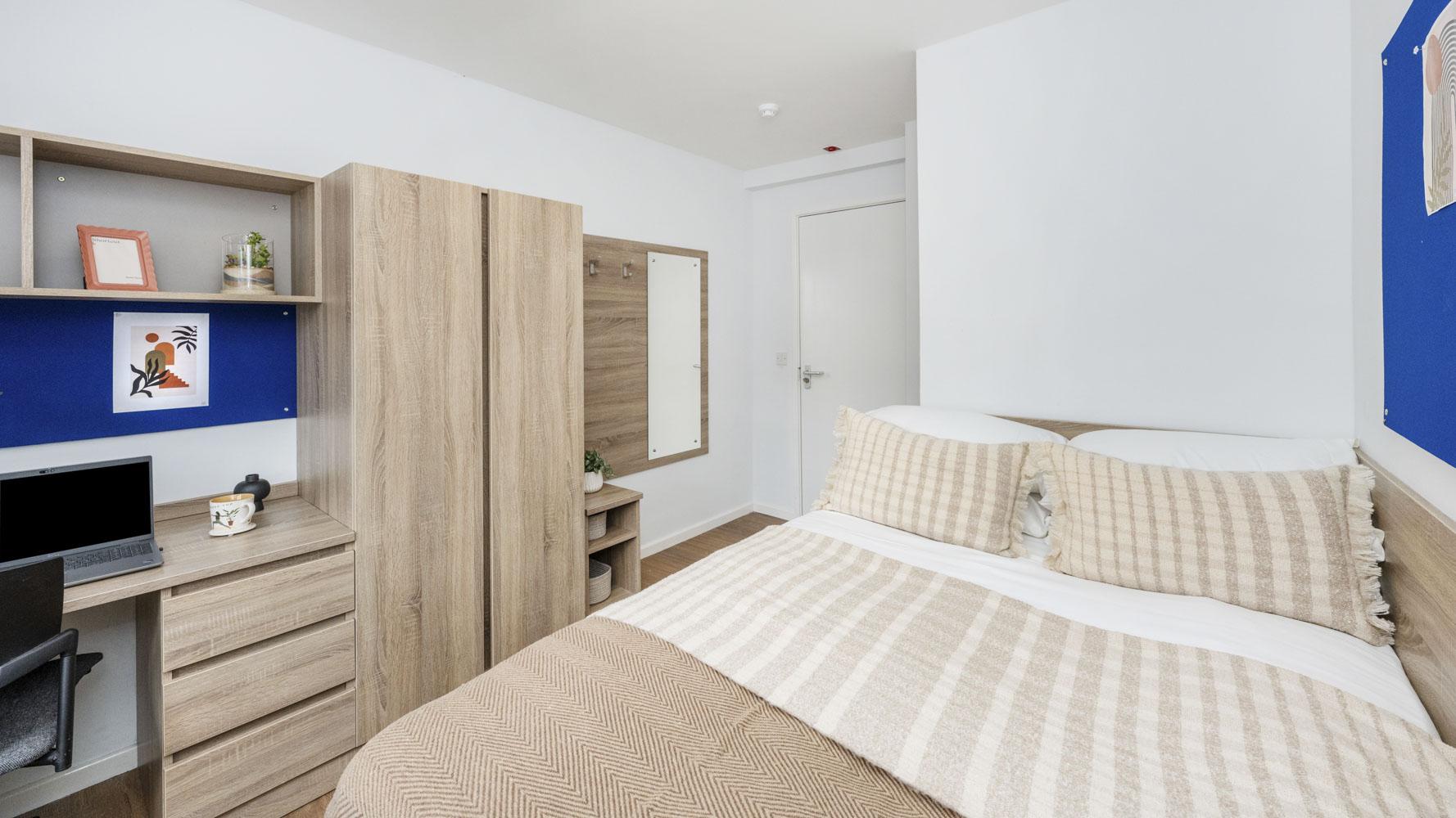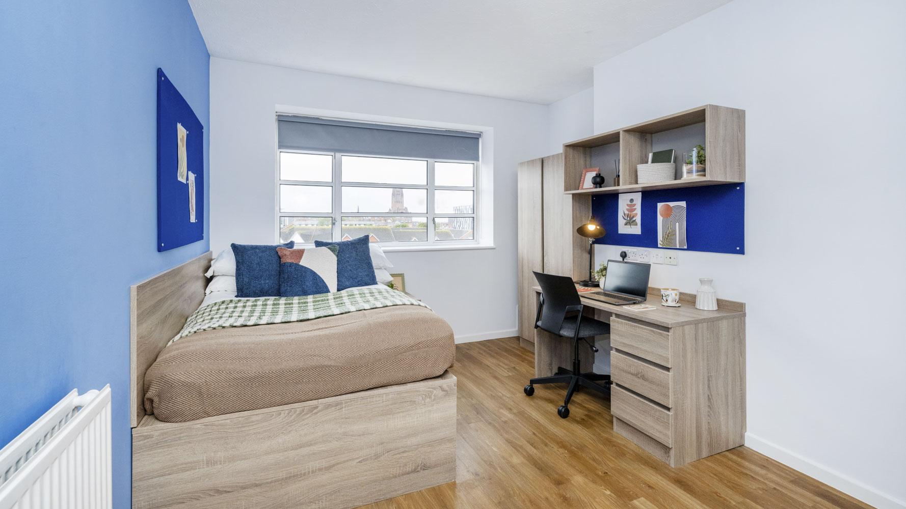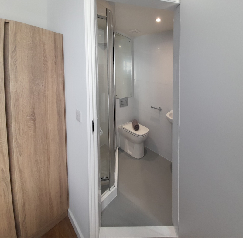 Our newly refurbished Ensuite room style measures 12.5sqm and come complete with a 3/4 bed with storage in a 3-5 bed cluster flat. You will share a kitchen area with breakfast bar with your flatmates – did someone say games night?! You’ll have your own en-suite bathroom so forget about having to queue for a shower. Your room also features a wardrobe, desk and study chair, tons of shelf space, bedside table and large windows offering great views of Liverpool City Centre.