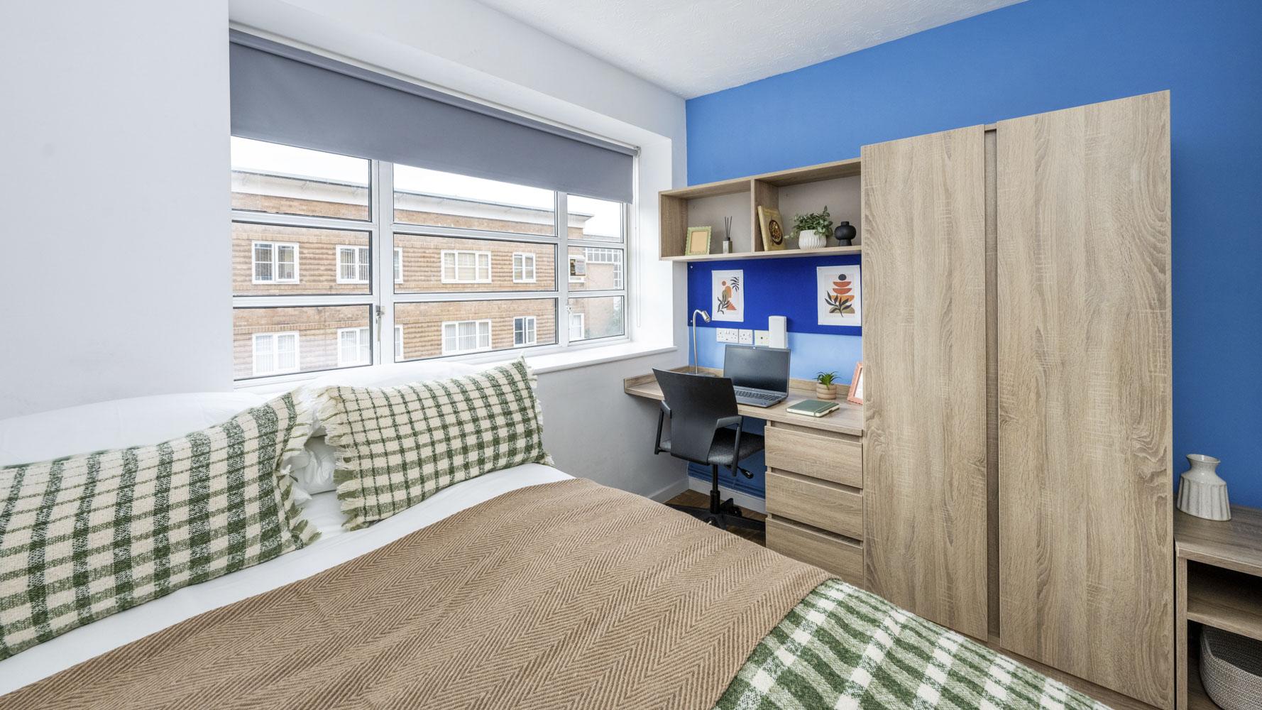 Our newly refurbished Ensuite Plus room measures 12 sqm comes equipped with a 3/4 bed with storage in a 3-5 bed cluster flat. With a shared kitchen area and breakfast bar so you can get to know your flatmates. This style features an en-suite bathroom so you can take as many long showers as you want. You’ll have a wardrobe, desk and study chair, shelf space, a bedside table and large windows letting in lots of daylight. It’s the ultimate study space so you can crack on with any uni work!
