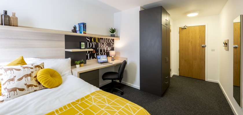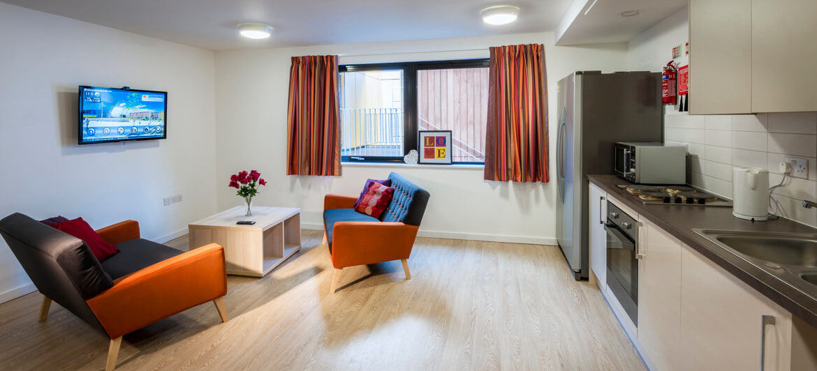 The en-suite room, with an average floor plan of 14.9m2, offers plenty of space. Simply add bedding to the large bed, and towels to the en-suite shower room. Fitted furniture provides ample storage while the shared area includes a modern kitchen and lounge with all the essentials, including a TV, fridge/freezer and microwave, just bring your utensils.