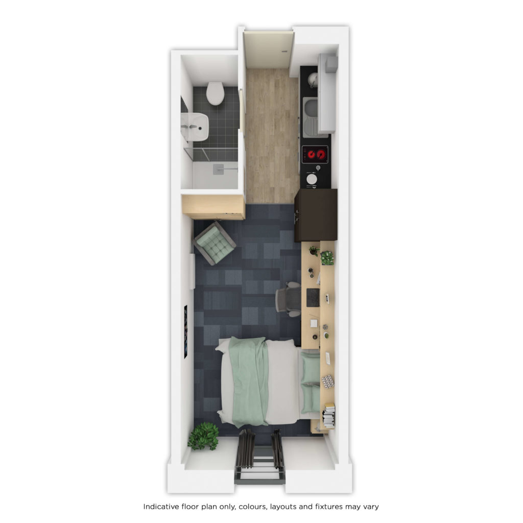 Located along the buildings front façade the studio is spacious, modern and well equipped. The kitchen includes a fridge/freezer, microwave, toaster and kettle, and there’s a TV, large bed, armchair and ample study area – just add bedding, towels and utensils to make it feel like home. The silver studios vary slightly in size due to their position within the listed building.