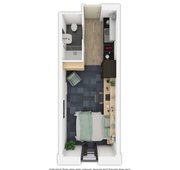 Located along the buildings front façade, the studio is modern and well equipped. The kitchen includes a fridge/freezer, microwave, toaster and kettle, and there’s a TV, large bed and ample study area – just add bedding, towels and utensils to make it feel like home.