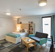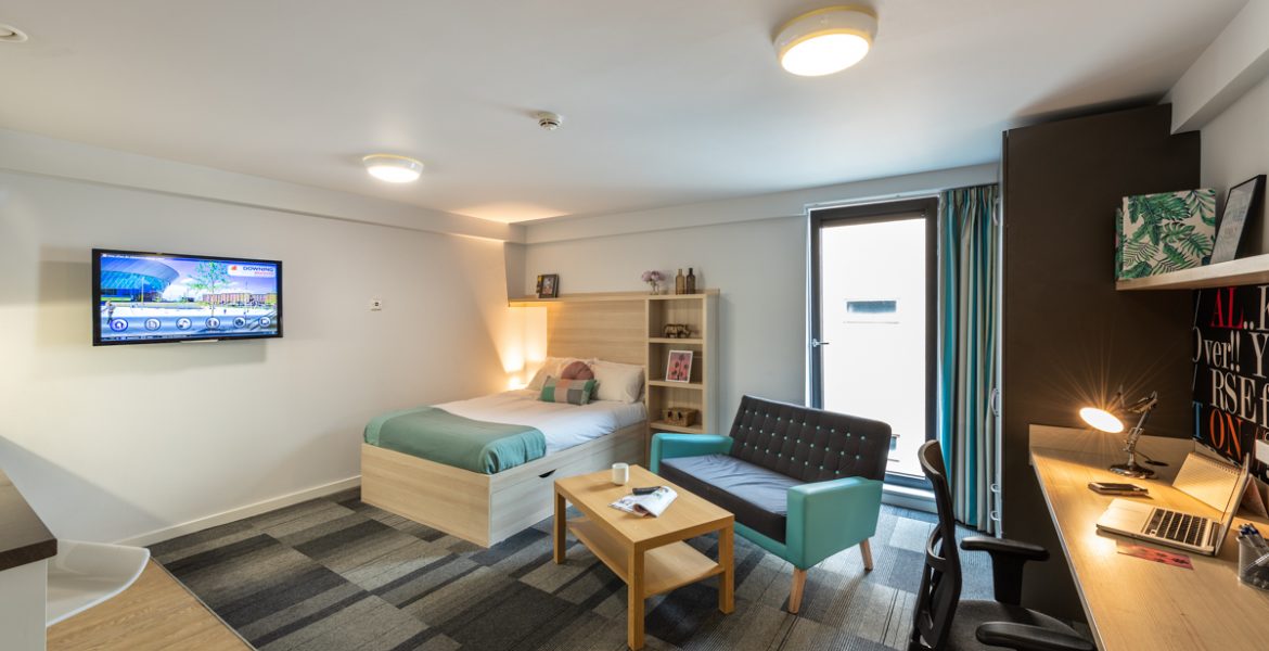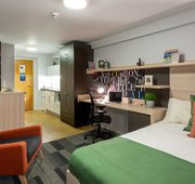 This is spacious student living at it’s best. At an average 32.3m2, the studio comes equipped with stylish fitted furniture, a modern kitchen, large comfy bed and TV. A fridge/freezer, microwave, kettle and toaster are supplied. Just add your choice of bedding, towels and kitchen utensils. A vacuum cleaner, iron and ironing board also available to use from Reception.