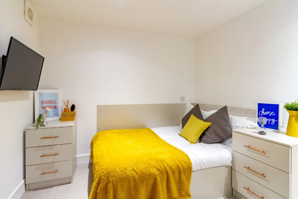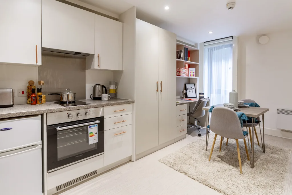 EPC Band Rating B. Self-contained studio living starts here for you and perhaps your plus one. If you choose to share the en-suite shower room, double bed, bags of storage, fitted kitchen and study area, theres no more to pay.