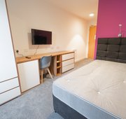 Larger Studio, Luxury Furniture, Featuring a small double bed, with memory foam mattress, luxury furniture pack TV, 32” smart tv, microwave, two ring hob, study area with desk and chair, lots of storage and private en-suite, these rooms provide you everything you need when you want some privacy.