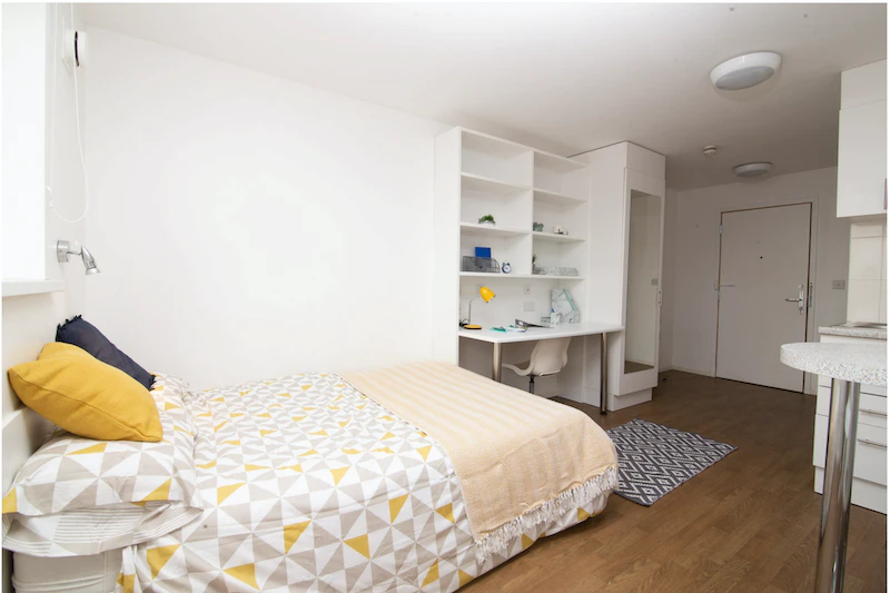 The Platinum Studio is an extra bright studio of approximate 23m2 in size. The room features all modern amenities for easy and comfortable living. It includes a double bed with under bed storage, wardrobe, private bathroom, private kitchen having fridge, 2 ring induction hob and microwave grill. The room also contains a TV, a breakfast bar with stools and a good study space. The Platinum Studio is perfectly laid out with good storage and a great living area. Residents will have access to the following communal areas/facilities: bike store, laundry room, ground floor common room and roof terrace. WiFi Desk & Chair Double Bed En Suite Kitchenette