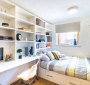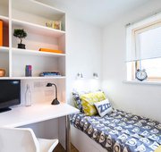 Silver En-Suite is a private room nicely built in approximate 11m2 size. The room is featured with all modern amenities attached for easy and comfortable living. It includes 4 lockable private bedroom having a single bed with under bed storage, wardrobe, private bathroom, shared kitchen. The en-suite also includes TV, study space having a desk and a chair. Silver En-Suite is perfectly featured for sharing between 4 students with good storage and living space. Residents will have access to the following communal areas/facilities: bike store, laundry room, ground floor common room, roof terrace.