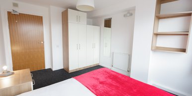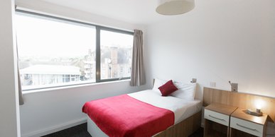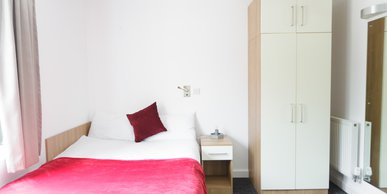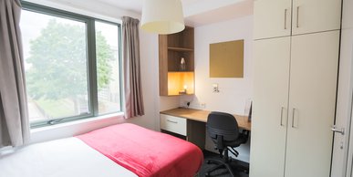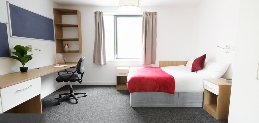 A room featuring a bed, a study desk, a wardrobe, an en-suite bathroom and a private kitchen with a fridge/freezer and a microwave. Flexible short and long term rates are available.