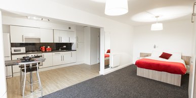 A 26m2 studio featuring a double bed, a study desk, a wardrobe, a bedside table, an en-suite bathroom and a private kitchen with a fridge/ freezer and a microwave. Flexible short and long term rates are available.