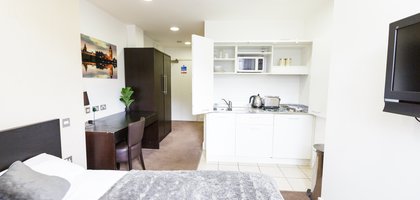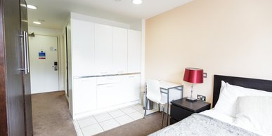 The contents of a typical Axo Oxford Circus student accommodation room include a large bed, a study area (with a chair a desk), an ensuite bathroom and storage. The rooms are spacious enough to move around. So, you can easily slip in a quick workout in the middle of it. All the rooms at Axo Oxford Circus accommodation come with a modern integrated kitchenette where you can whip up a quick bite or an elaborate meal for yourself and your friends. When you’re bored and need some entertainment, switch on the flat-screen TV and watch a show of your liking. Do you consider ice lollies to be your comfort food? You can store them in the freezers offered at Axo Oxford Circus.