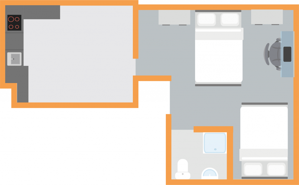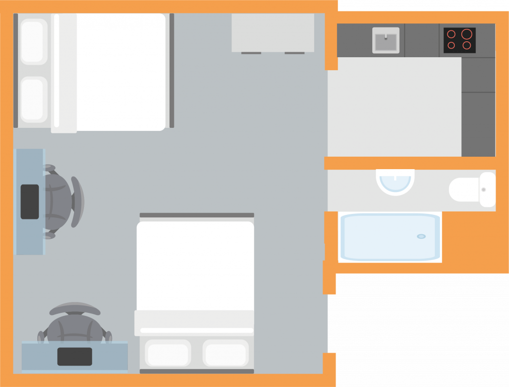 A spacious self-contained shared studio measuring approx 25-27m² with two 3/4 beds. All of our Gold Twin Studio have a private kitchenette and a modern en-suite bathroom as well as study desks and plenty of storage.